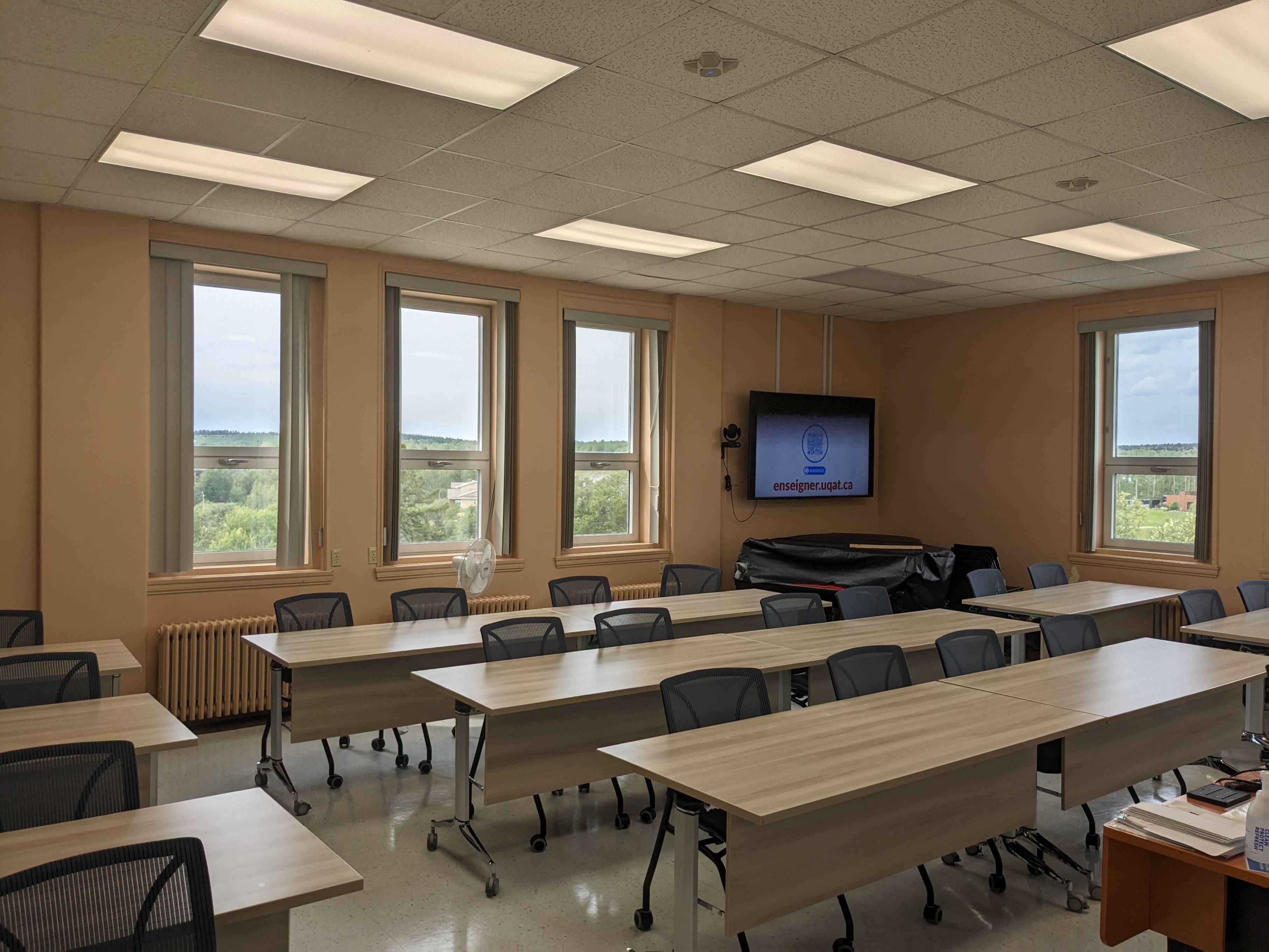 ![]() Avant de la salle de classe, tableau blanc, téléviseurs, caméra étudiant, podium professeur. | ![]() Arrière de la salle de classe. téléviseur et piano. |