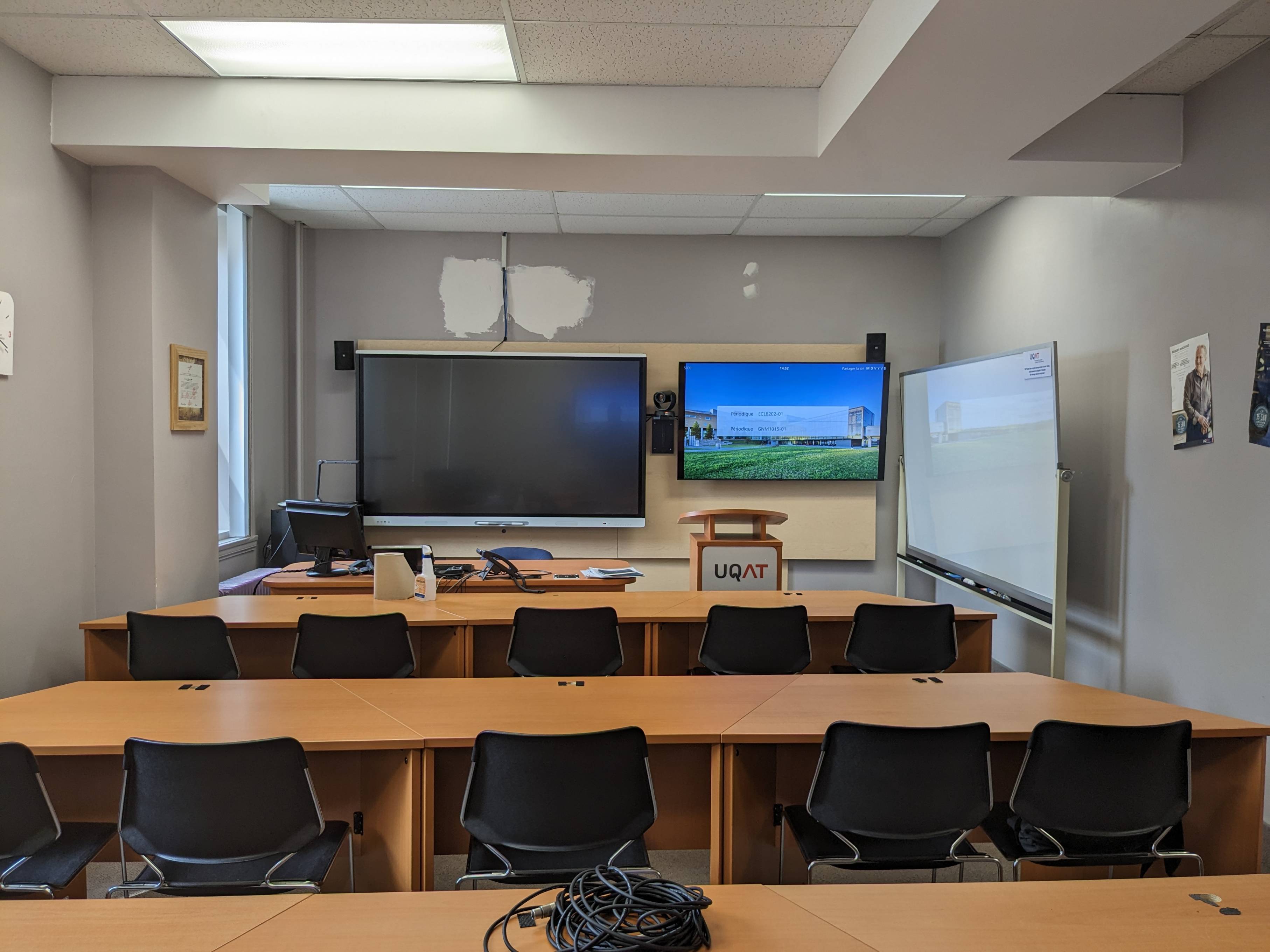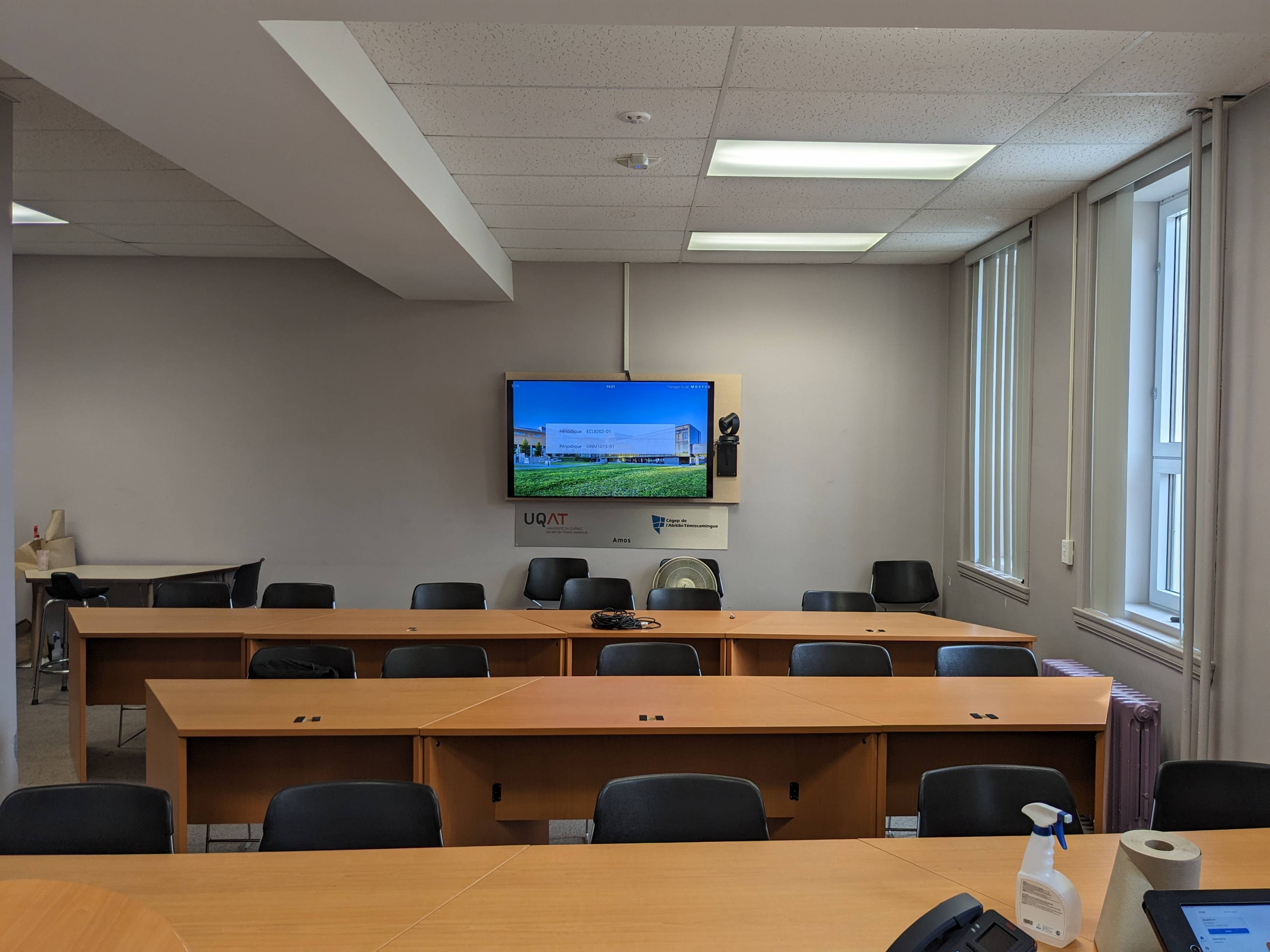 Celle salle de visioconférence Zoomroom est idéale pour l’enseignement comodal lorsque des étudiants suivent le cours à la maison ou regroupés dans d’autres centres et campus. La voix de l’enseignant est captée par un micro (pieuvre) sur le bureau et la voix des étudiants en classe sera captée par les micros (pieuvre) installés au plafond.
