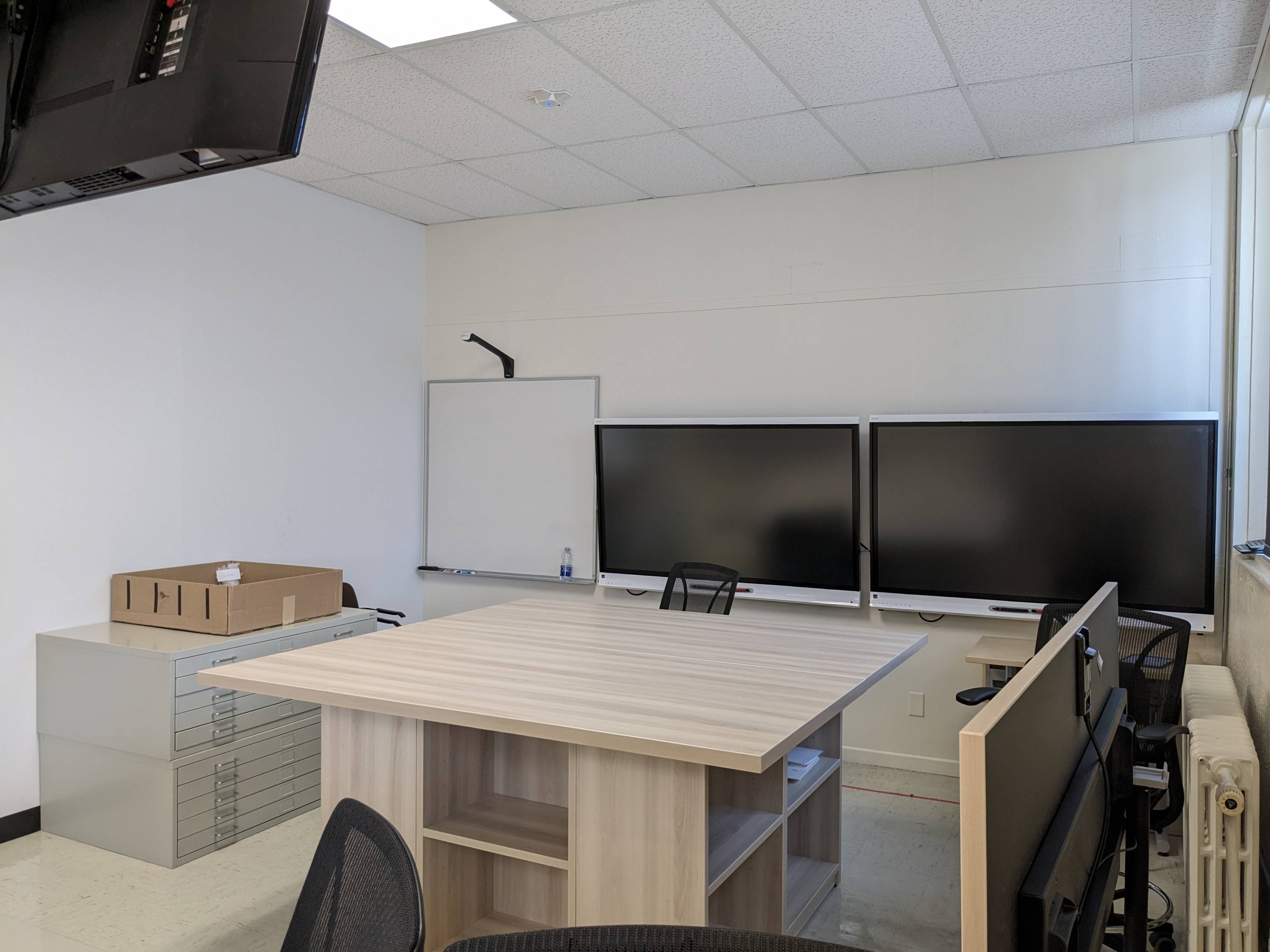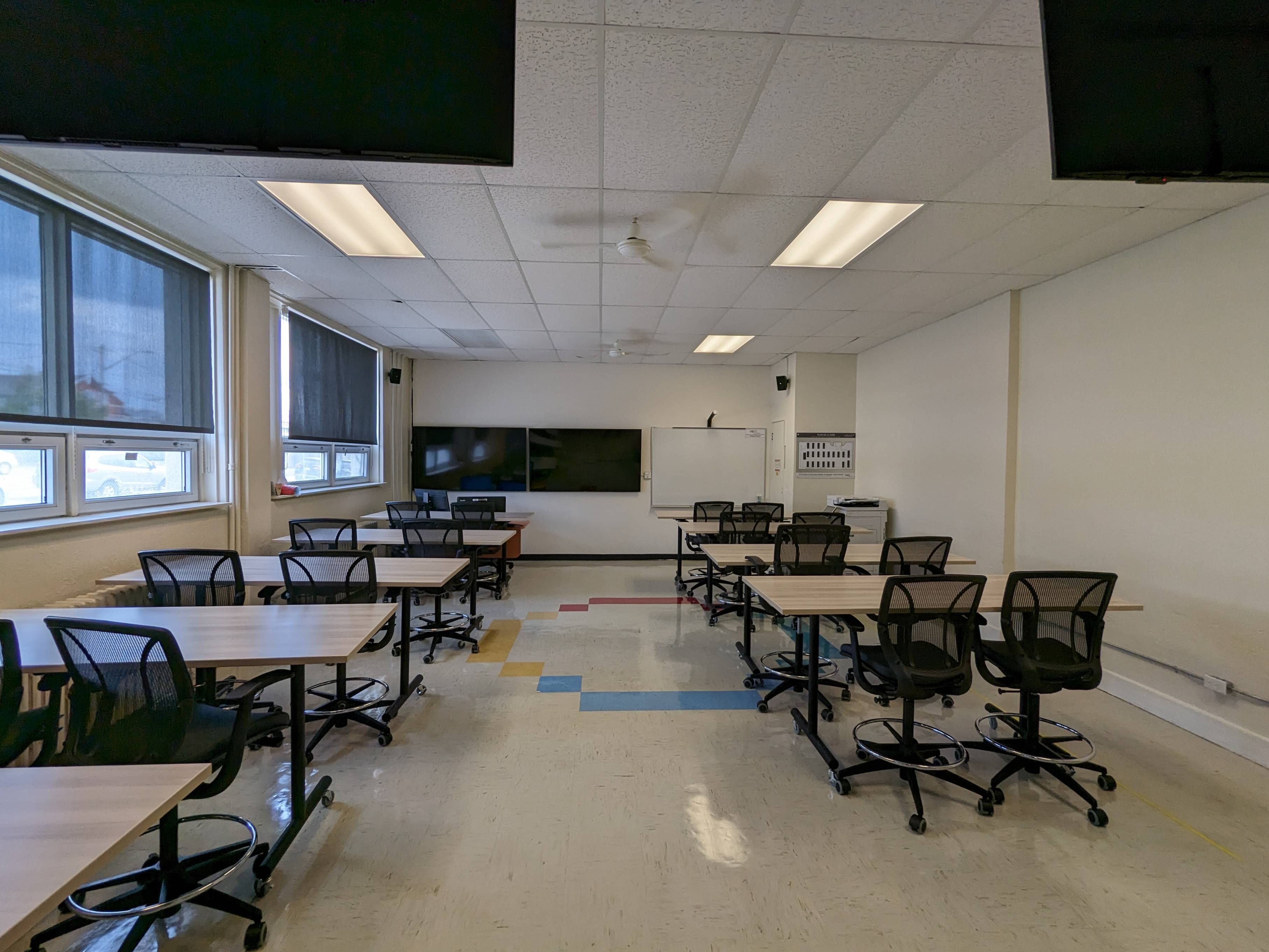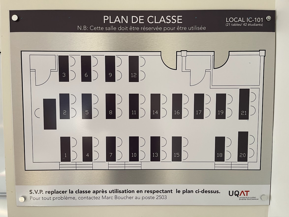Le IC101 est une salle de classe avec capacité pour la comodalité située au 1er étage de l’édifice Immaculée Conception. Il est muni de grandes fenêtres à battant et donne accès à une belle lumière naturelle. Sans être séparé par une division officielle, ce local est disposé en 2 sections. Un rideau métallique rétractable peut être utilisé pour séparer les deux parties. Dans la section avant, on retrouve des tables, des chaises, et le bureau principal. C’est cet espace qui sera utilisé pour l’enseignement et la comodalité. A l’arrière du local, des ilots sont placés de sorte à faciliter le travail d'équipe. Des tableaux blancs effaçables à sec sont également à la disposition des participant·e·s.