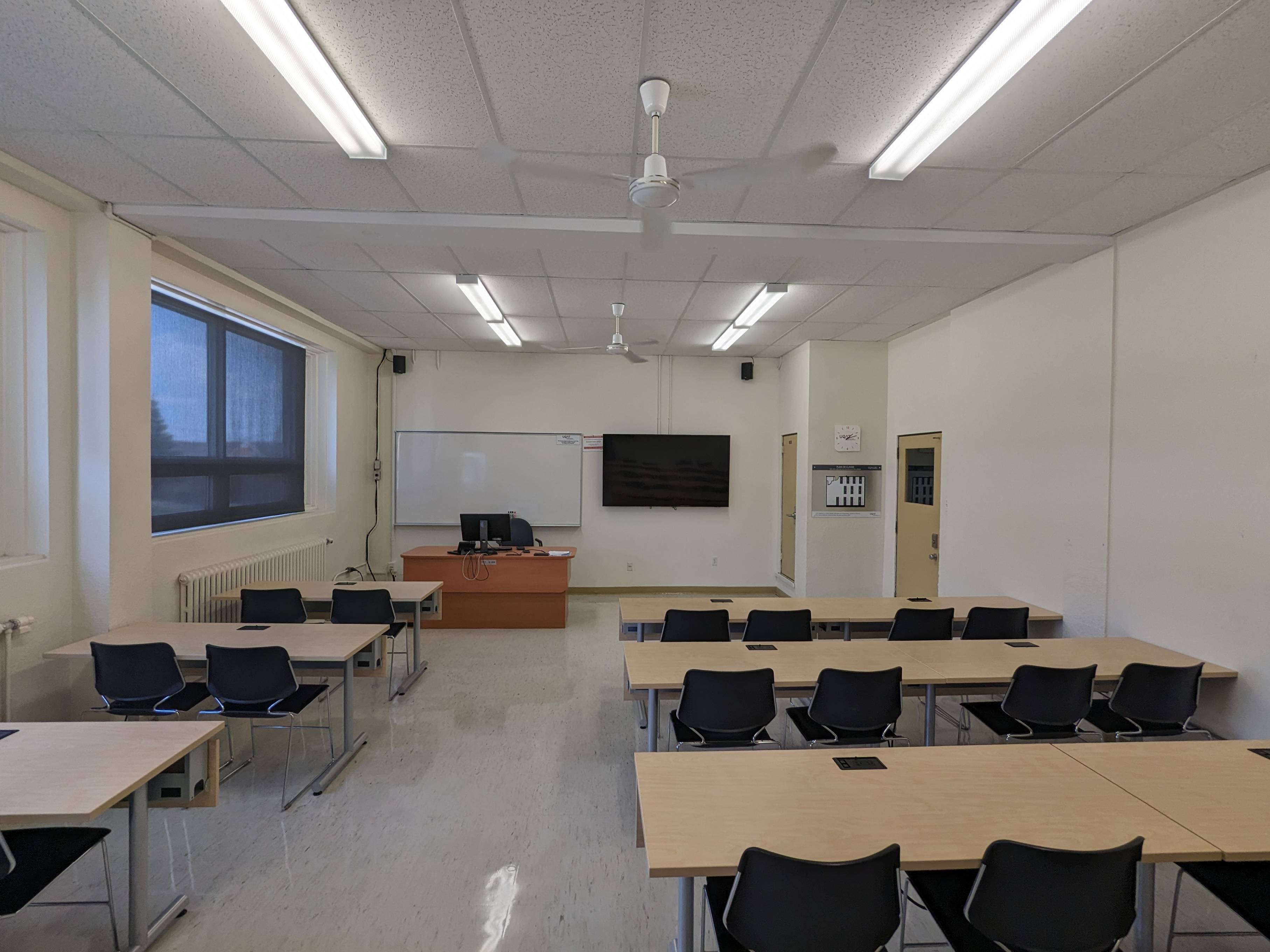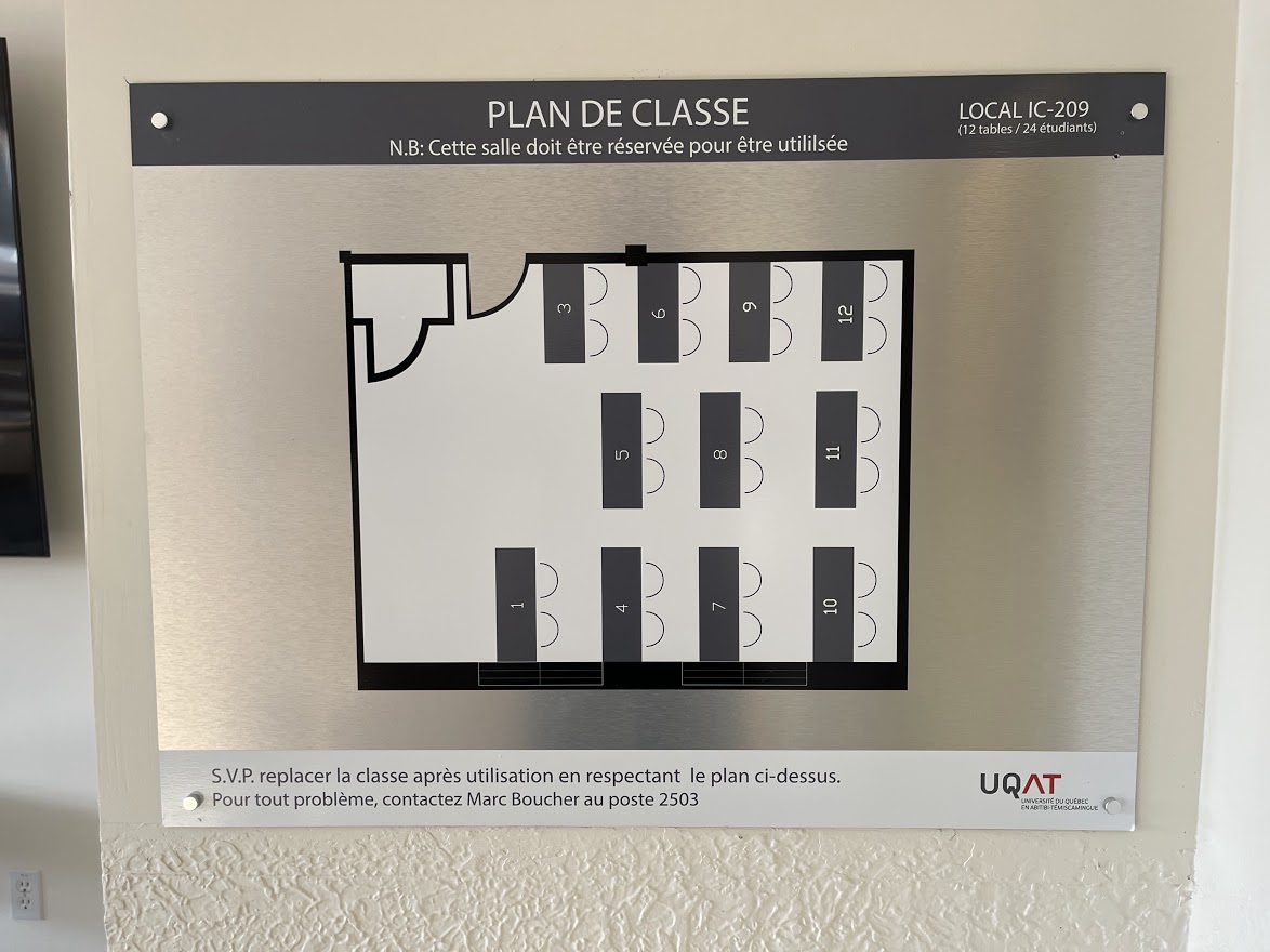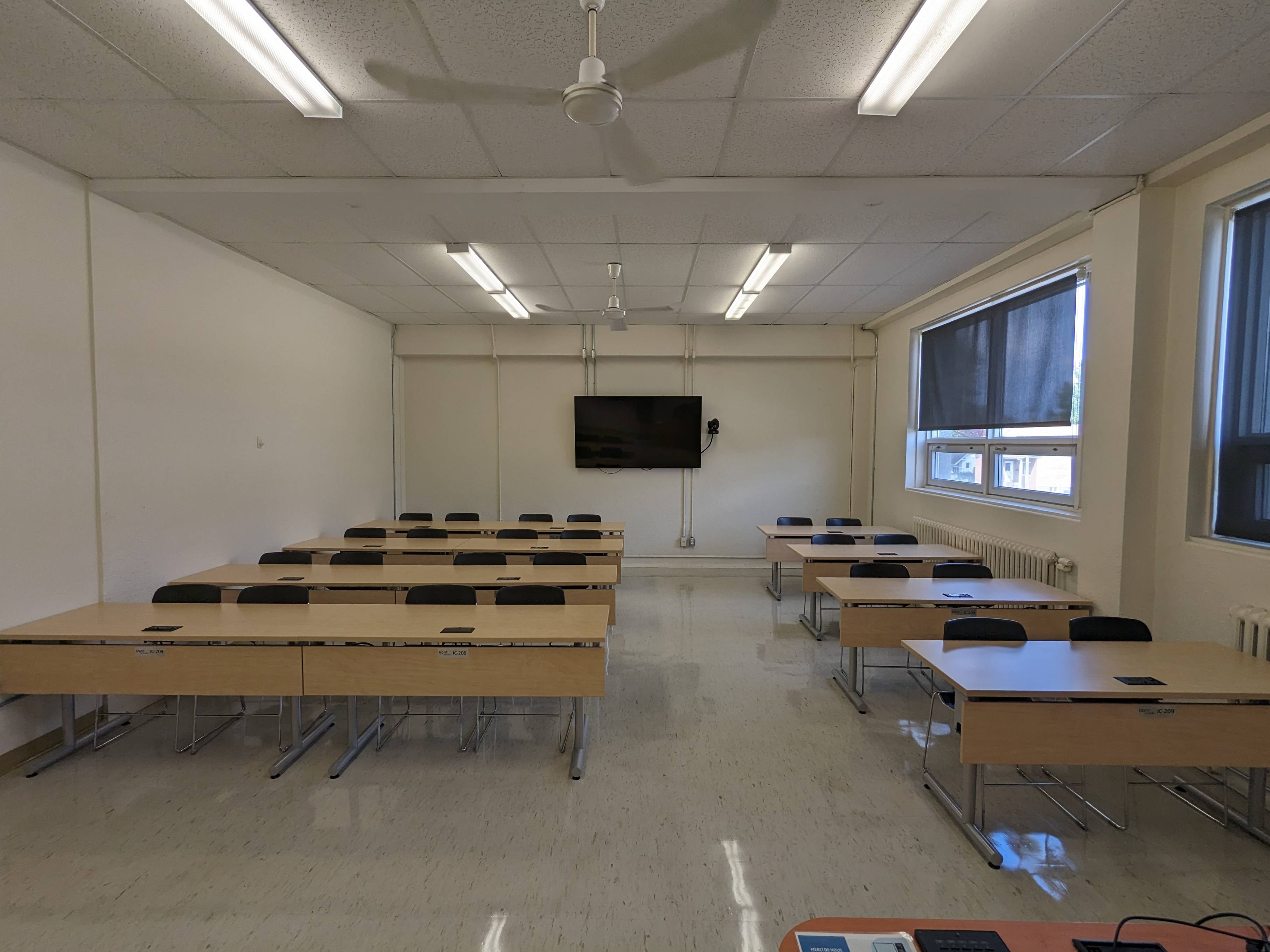 Le IC209 est une salle de classe située au 2ième étage du pavillon Immaculée Conception. Elle est munie de 2 grandes fenêtres à battant et offre un bel éclairage naturel. Bien que ce local soit initialement conçu pour l’enseignement magistral, la tenue de rencontres en comodalité est quand même possible. En effet, la caméra et les écrans fixés aux murs, ainsi que le microphone qui se trouve sur le bureau principal permettent ce genre de présentation.