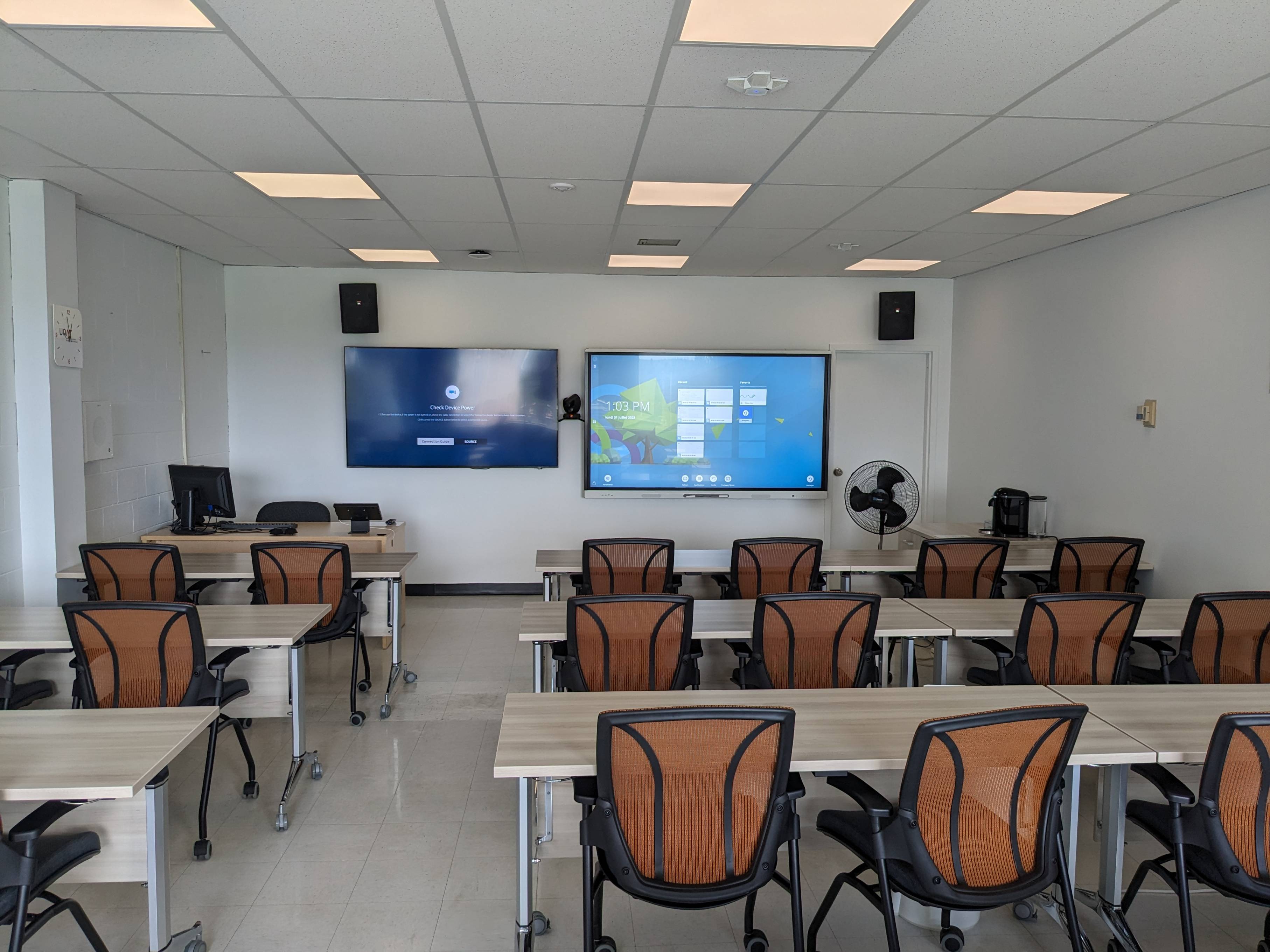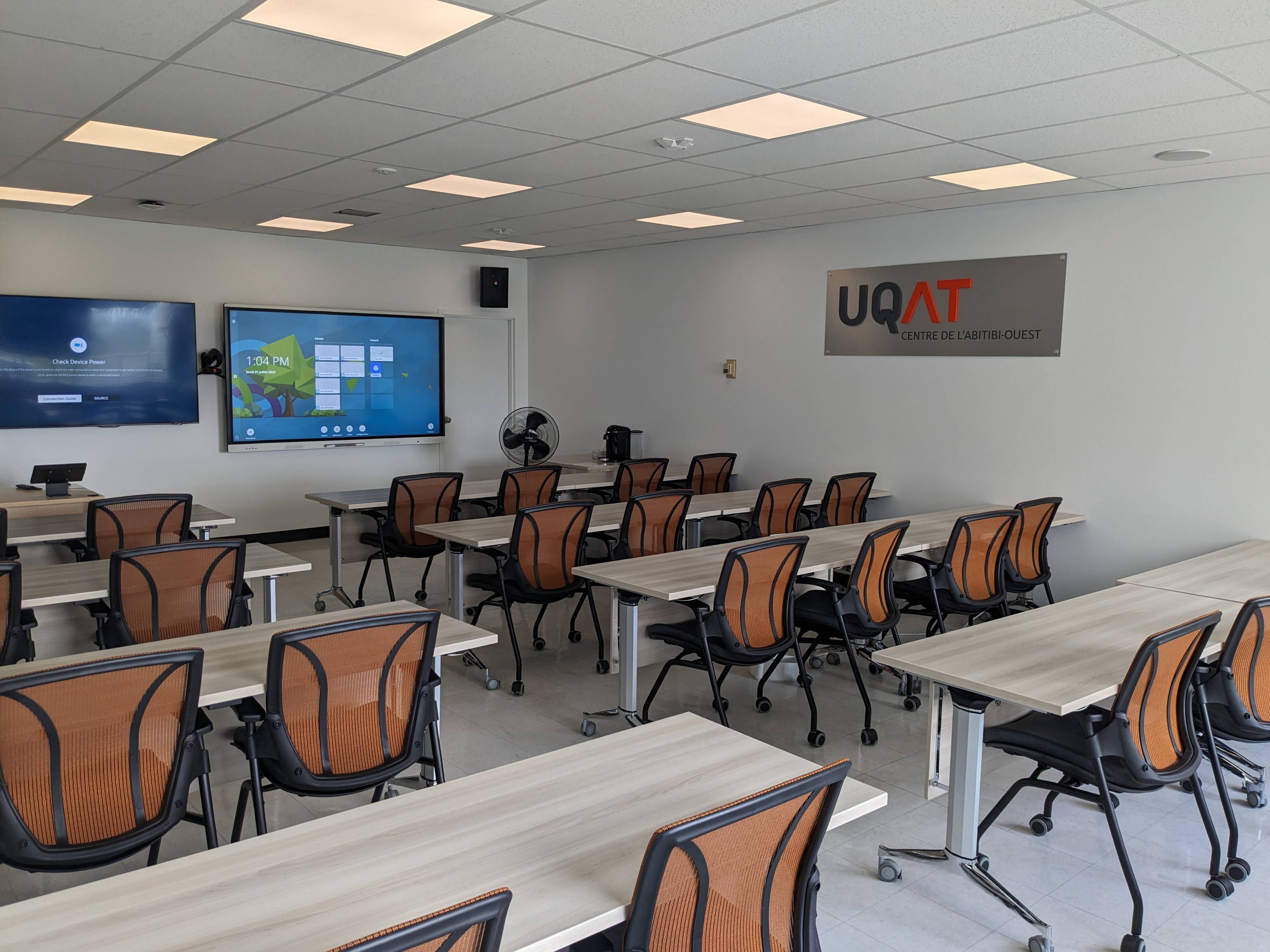 LE B105 est situé au 1er étage du pavillon de La Sarre. Ce local de type Zoom Rooms est muni d’équipements audiovisuels tel que des écrans, des caméras et des microphones, qui permettent la tenue de rencontres en comodalité, par visioconférence. Un tableau numérique interactif (TNI) est aussi accessible devant la classe. Les tables sont mobiles et peuvent être déplacées au besoin. Les microphones se trouvent au dessus des étudiant·e·s et sur le bureau de l’enseignant·e.