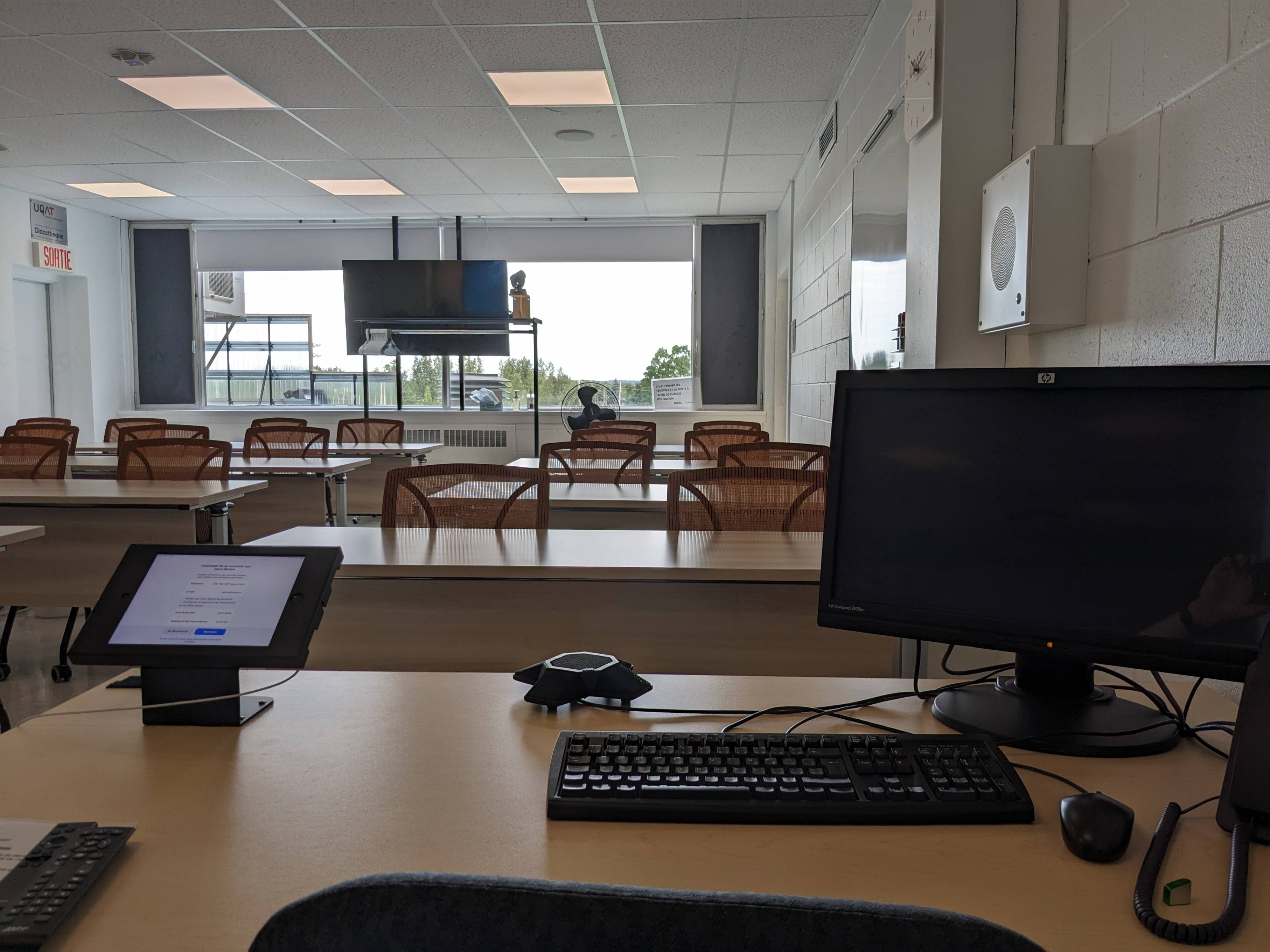 Branchement de son ordinateur personnel à la réunion Zoom : Un ordinateur est à la disposition des personnes enseignantes. Cependant, si l’utilisation d’un ordinateur personnel est souhaitée, aucun branchement filaire n’est possible dans le local. Il faudra donc se connecter directement à la rencontre Zoom par le code de la réunion. Il sera également important de mettre le microphone en sourdine pour éviter toute distorsion sonore.