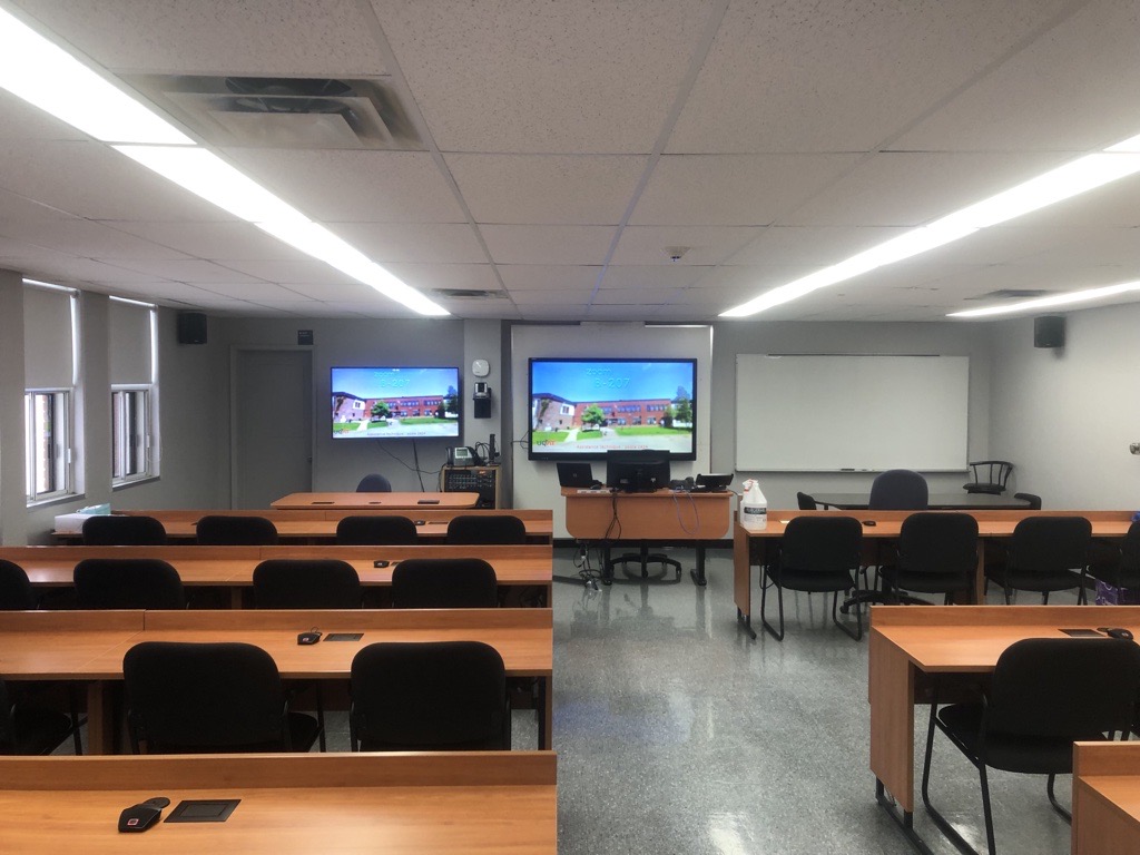 Situé au 2e étage, au fond de l’aile B, ce local bien éclairé par 6 fenêtres peut accueillir 36 étudiants. Le mobilier est constitué de tables fixées au plancher. Des prises électriques sur les tables permettent de brancher des appareils.