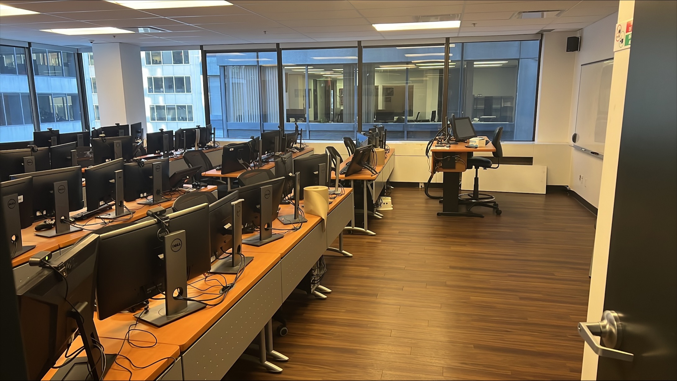 Grand laboratoire informatique pour CNM. Ce local est particulièrement lumineux possède une grande fenestration munie de toiles semi-opaques. De plus, il possède un écran téléviseur fixé au mur à l’avant et un deuxième à l’arrière. Un tableau blanc effaçable à sec est également fixé derrière le poste de l’enseignant.