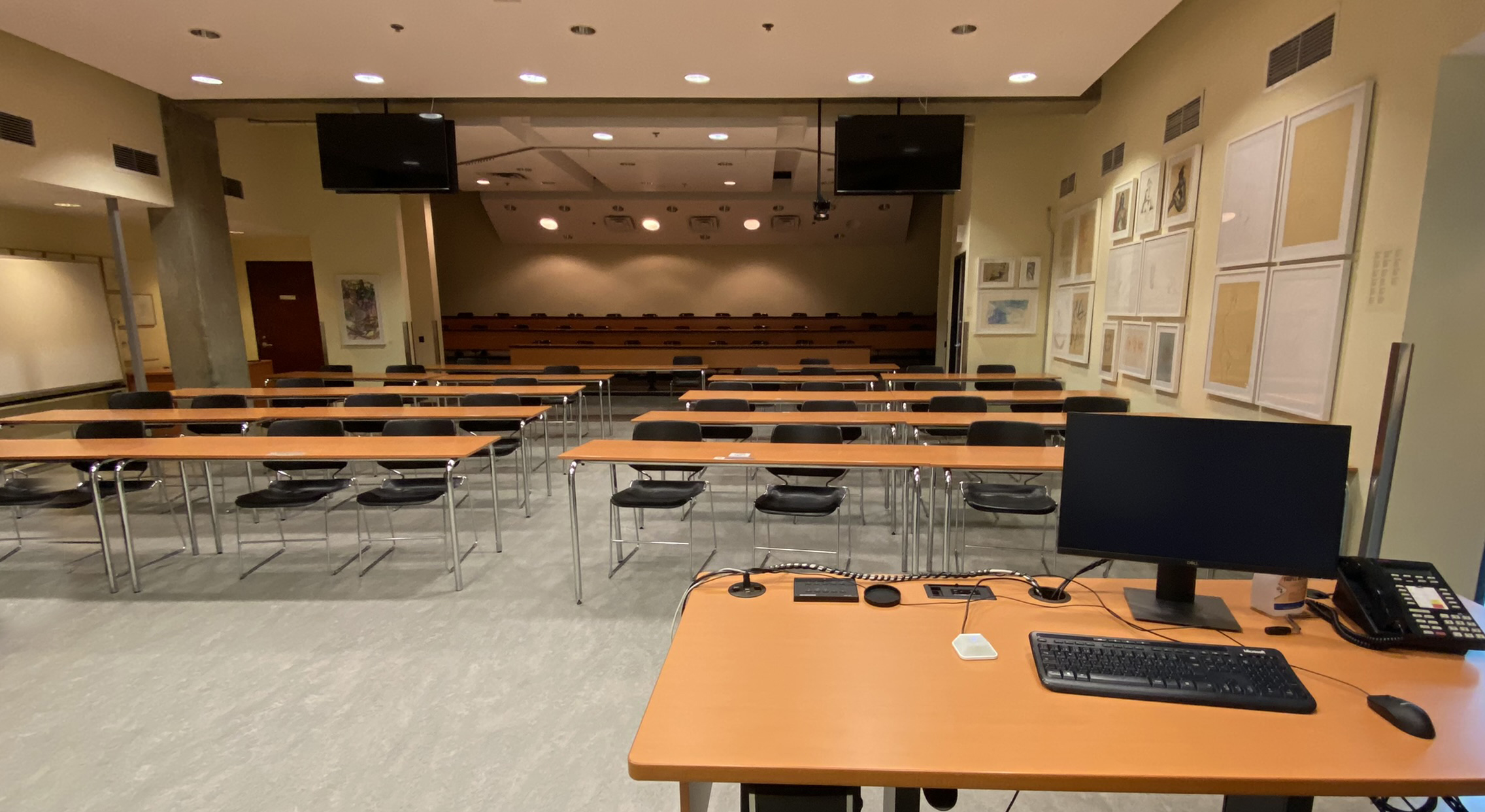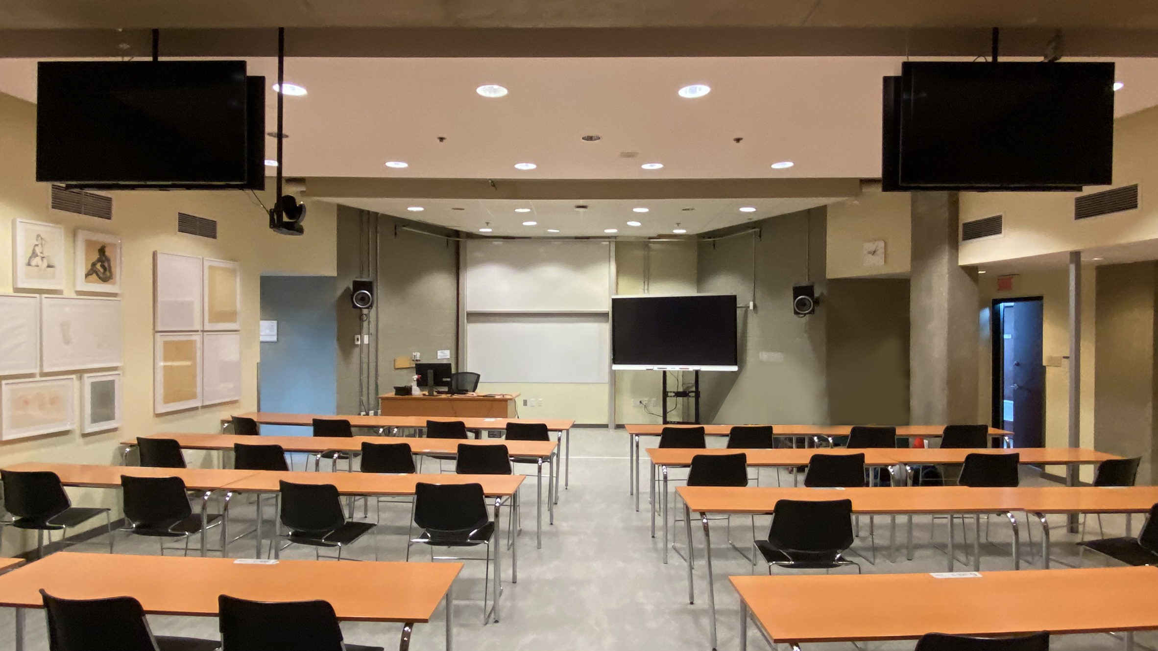 ![]() Podium professeur. | ![]() Arrière de la salle de classe, téléviseurs de rappel, caméra professeur. |