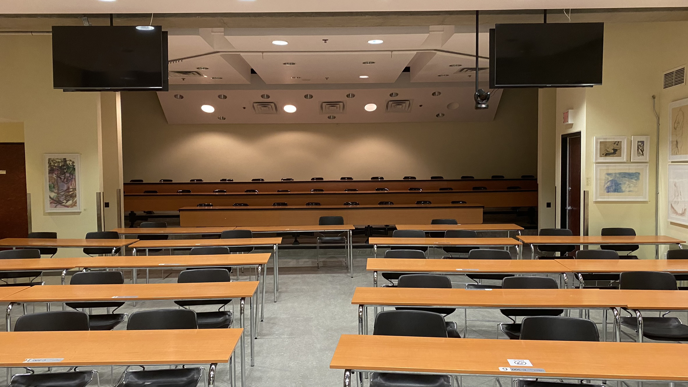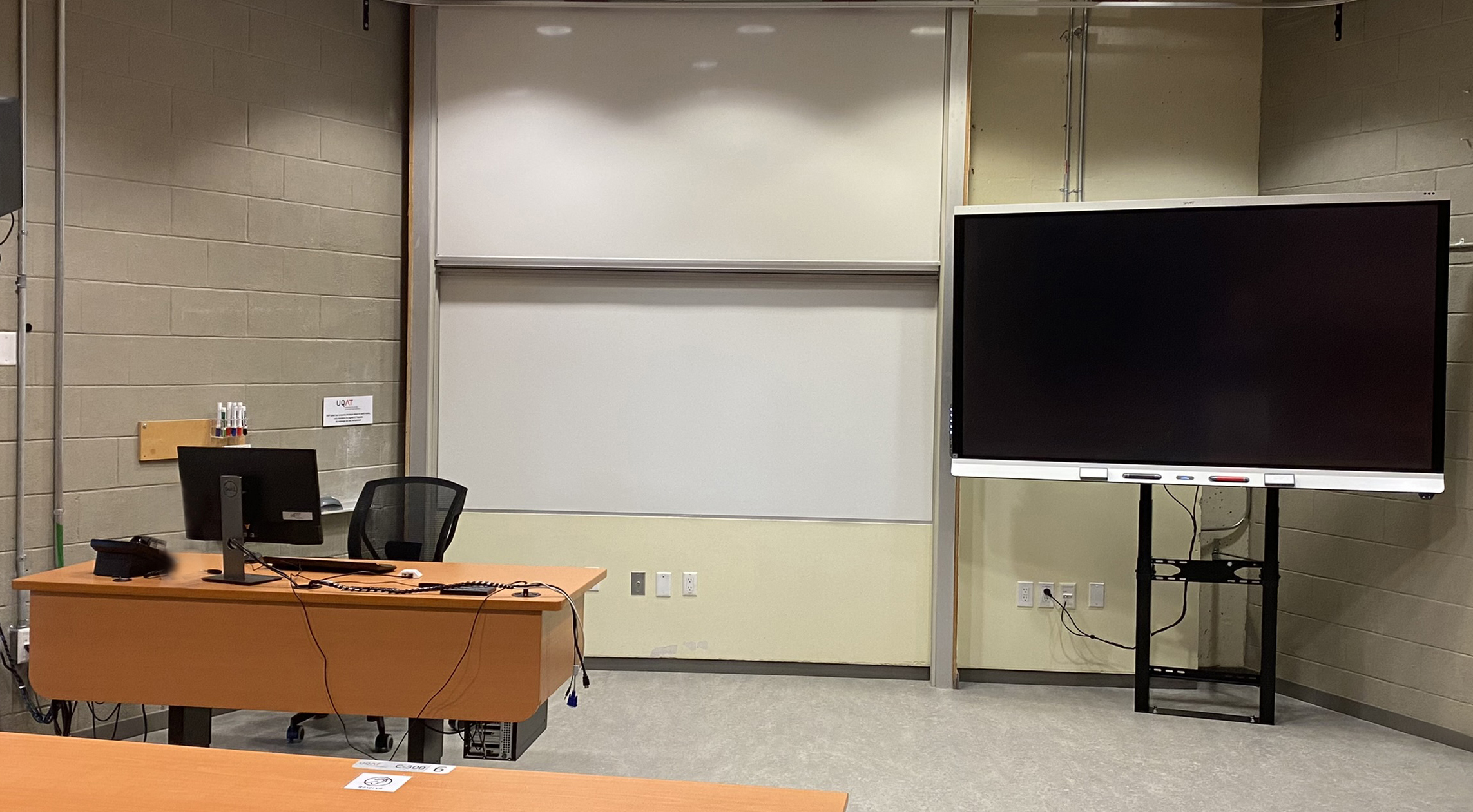 Le C300 est situé au 3e étage du campus de Rouyn-Noranda. Il s’agit d’une classe de type auditorium, sans fenestration. Les deux dernières rangées de tables sont de style auditorium à bancs fixes mais pivotants, alors que le reste de l’espace est meublé de tables de travail amovibles. À l’avant de ce local, on retrouve un tableau numérique interactif (TNI) et 3 tableaux blancs effaçables à sec, à coulisse. Puisqu’il a aussi été pensé pour la comodalité, des écrans et une caméra sont également fixés au plafond.
