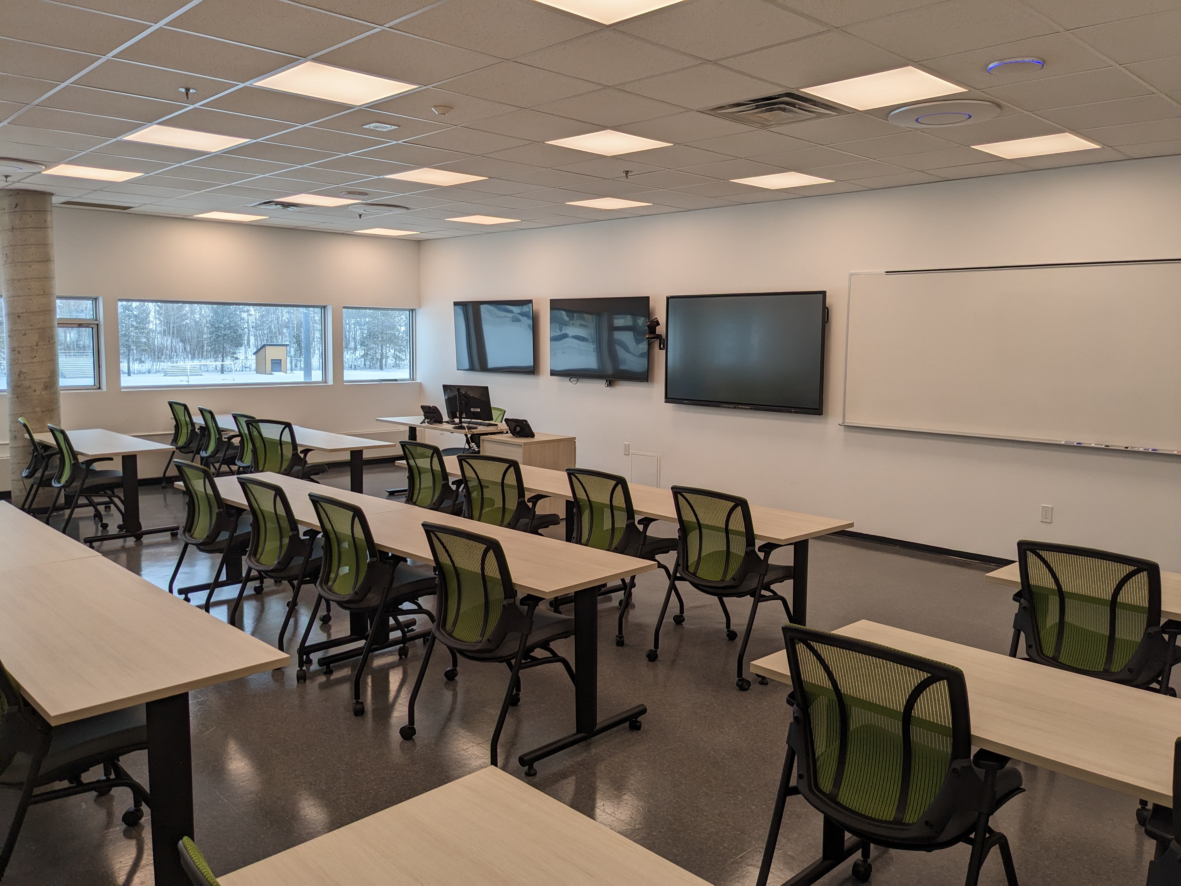 Le D204 se situe au 2e étage du campus de Rouyn-Noranda. Cette salle de classe de type Zoom Room offre une grande fenestration, donc beaucoup d'éclairage naturel. Équipée d’un tableau numérique interactif (TNI), de quatre écrans, de deux caméras (une à l’avant et une à l’arrière), de microphones et de haut-parleurs encastrés au plafond, elle permet l'enseignement à distance et la projection de documentation en toute simplicité. Un tableau blanc effaçable à sec est aussi disponible à l’avant de la classe. Tout le mobilier qui s’y trouve peut être déplacé et aménagé selon les besoins.