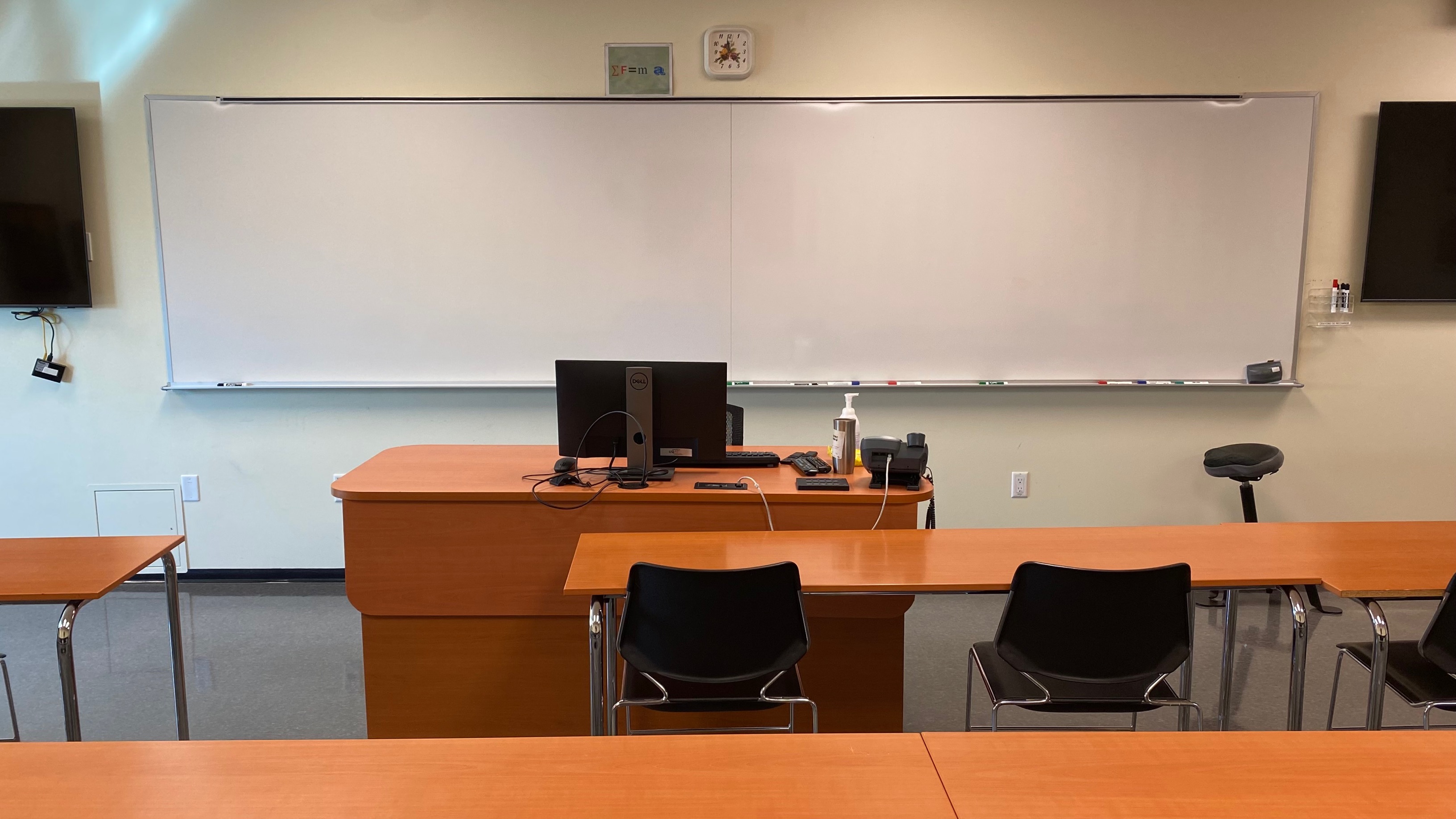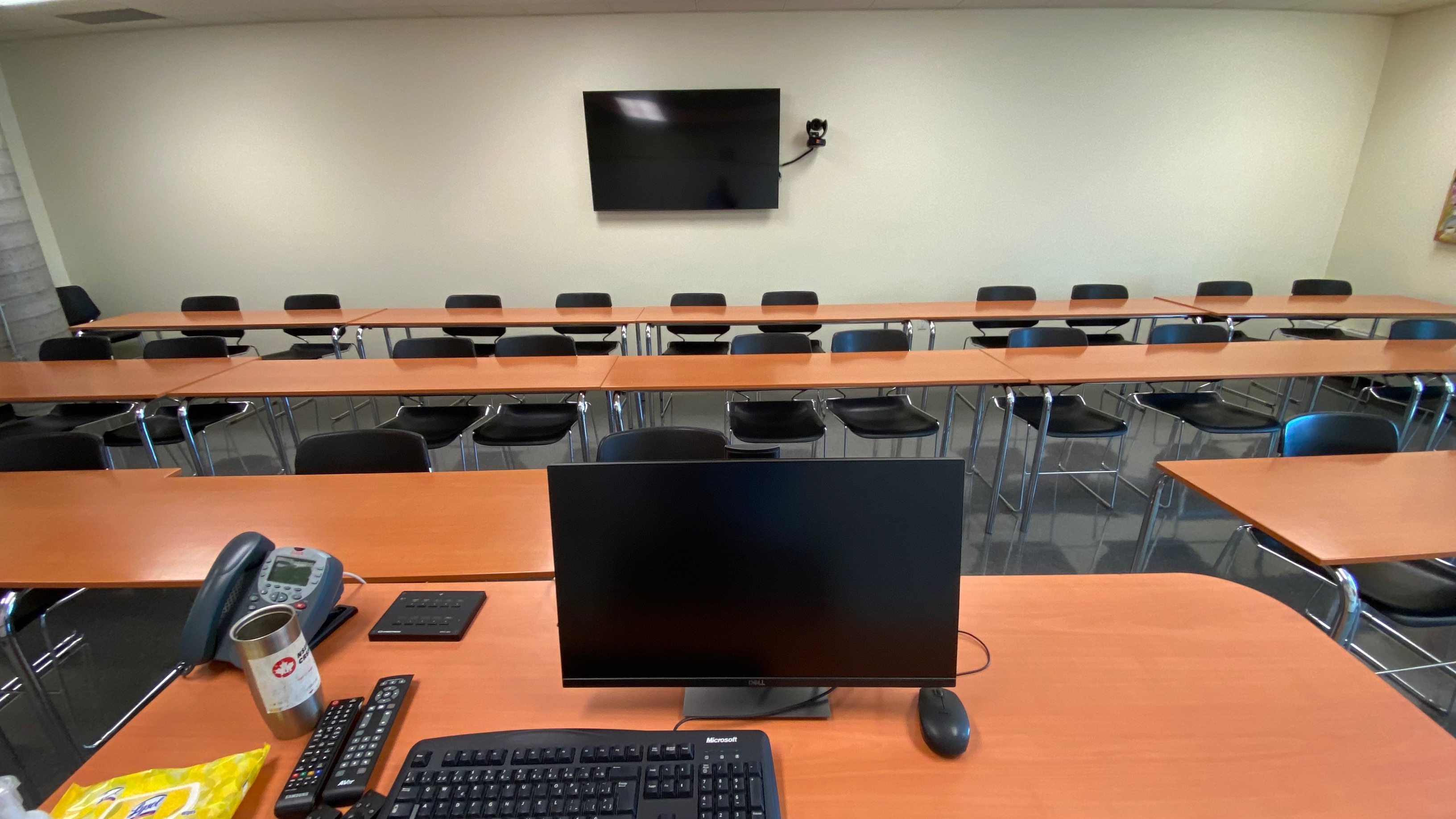 ![]() Avant de la salle de classe, tableau blanc et téléviseurs. | ![]() Podium professeur et tableau blanc. |