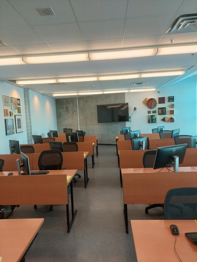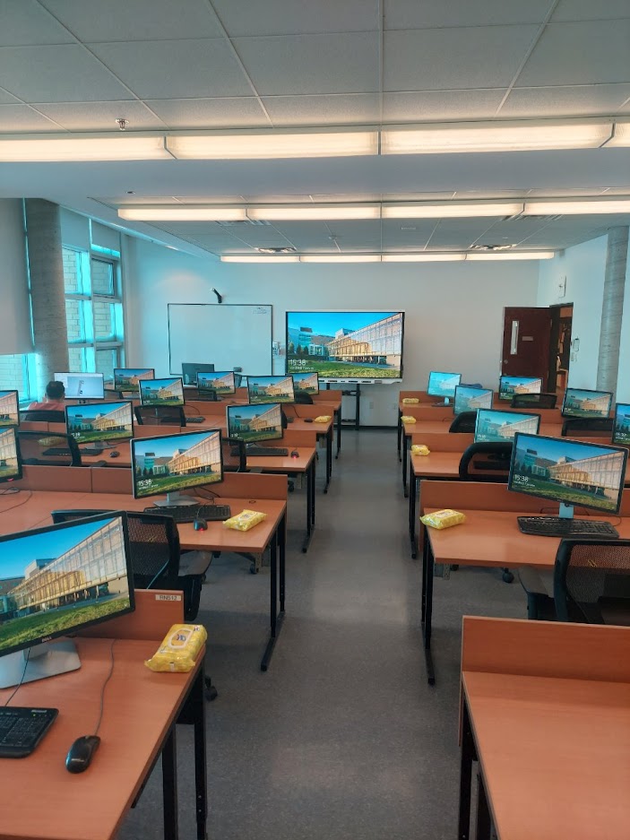 Le D302 est situé au 3e étage du campus de Rouyn-Noranda. Ce local, de forme allongée, sert principalement de laboratoire informatique. Les étudiant·e·s peuvent donc utiliser les équipements informatiques qui se trouvent à leur disposition. De plus, grâce aux moniteurs accrochés aux murs, au tableau numérique interactif (TNI) et à la caméra qui se trouve sur le mur à l’arrière du local, l’enseignement en comodalité y est aussi possible.