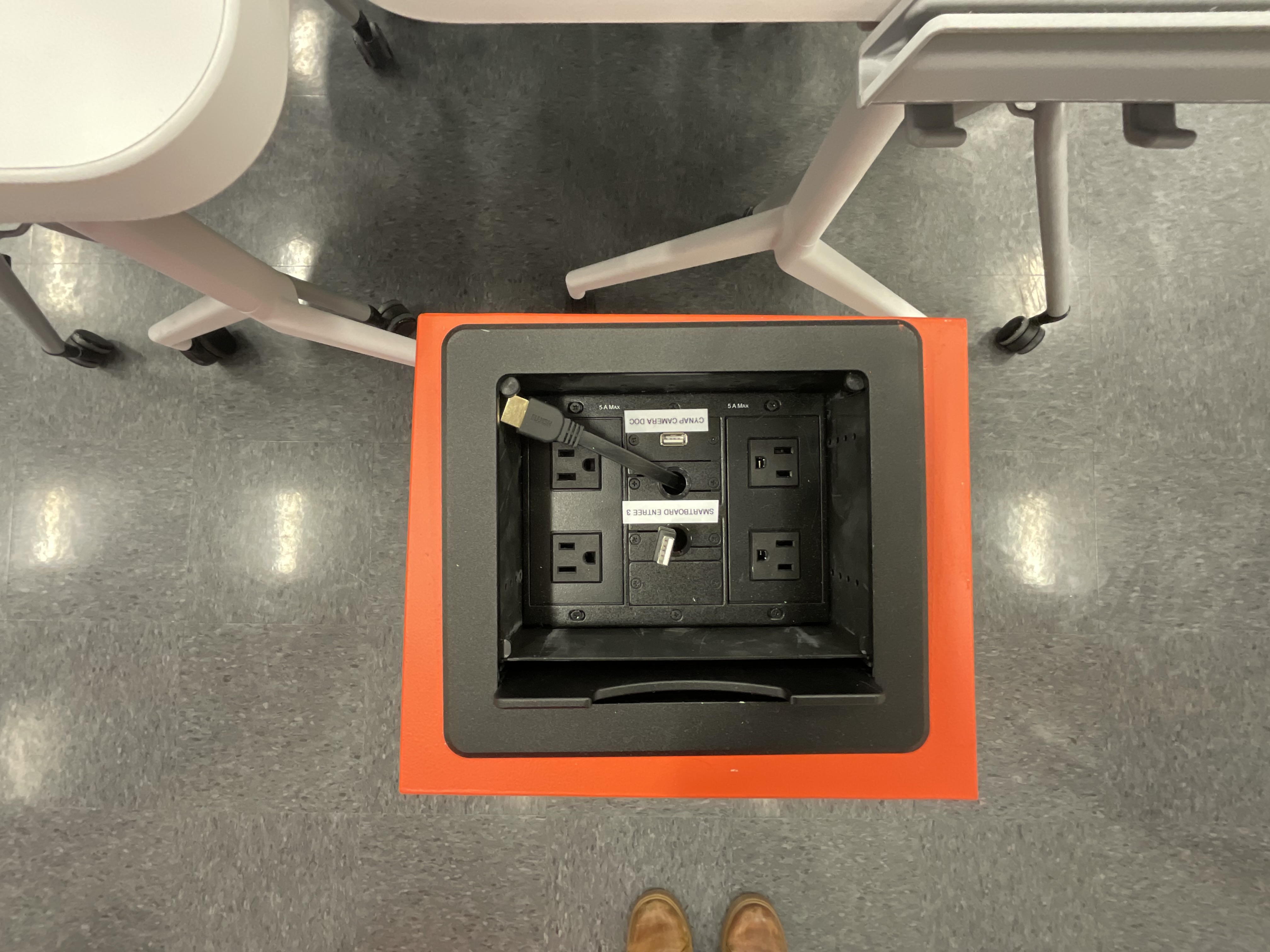 Des bornes électriques fixes sont annexées à chaque bloc de tables pour permettre le branchement d'équipements électroniques.