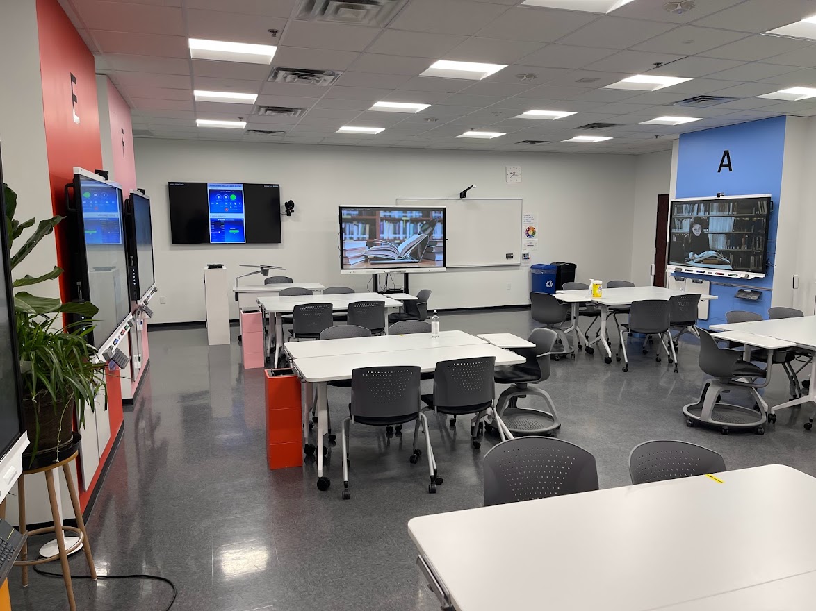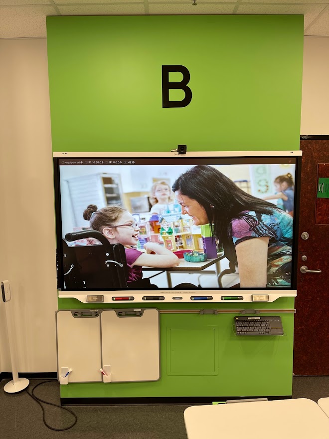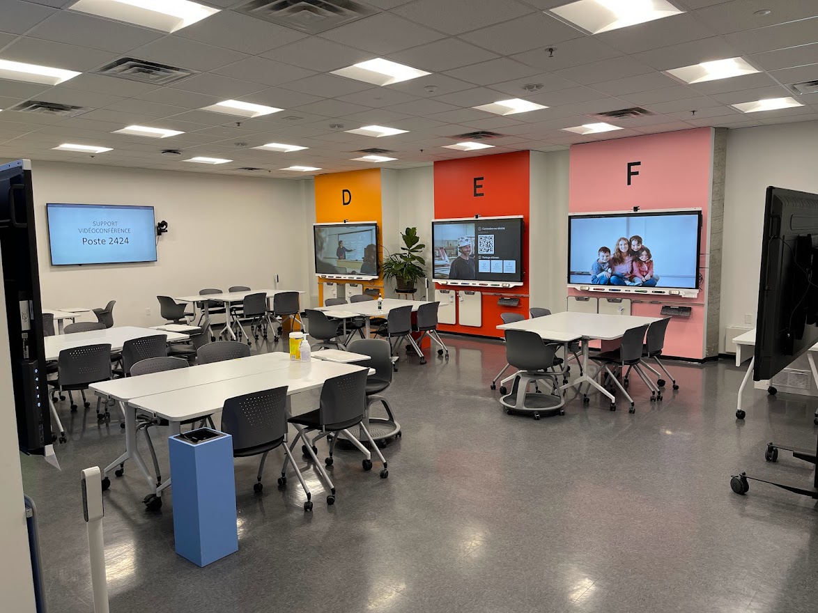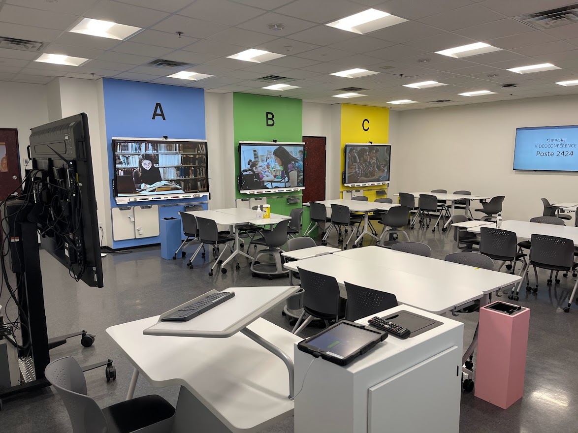 Le D304 se trouve au 3e étage du campus de Rouyn-Noranda. Cette salle de classe de type Zoom Room, communément appelée la CLAAC, a pour but précis de favoriser l’apprentissage actif et collaboratif. Elle permet également l’enseignement en comodalité, par l’utilisation de la plateforme Zoom. Deux caméras sont donc fixées aux murs pour permettre la projection de rencontres à distance. La polyvalence de l'aménagement, autant au niveau des appareils électroniques, du matériel que du mobilier, favorise grandement l’expérimentation de diverses approches pédagogiques et l’activation des connaissances. Huit tableaux numériques interactifs (TNI) sont à la disposition des participant·e·s pour le travail en grand groupe ou en sous-groupes. Des petits tableaux blancs portatifs effaçables à sec sont également accrochés sous ces TNI pour permettre les annotations. Un TNI supplémentaire, nommé le TNI maître, se trouve à l’avant du local et sert de contrôle principal à la rencontre.