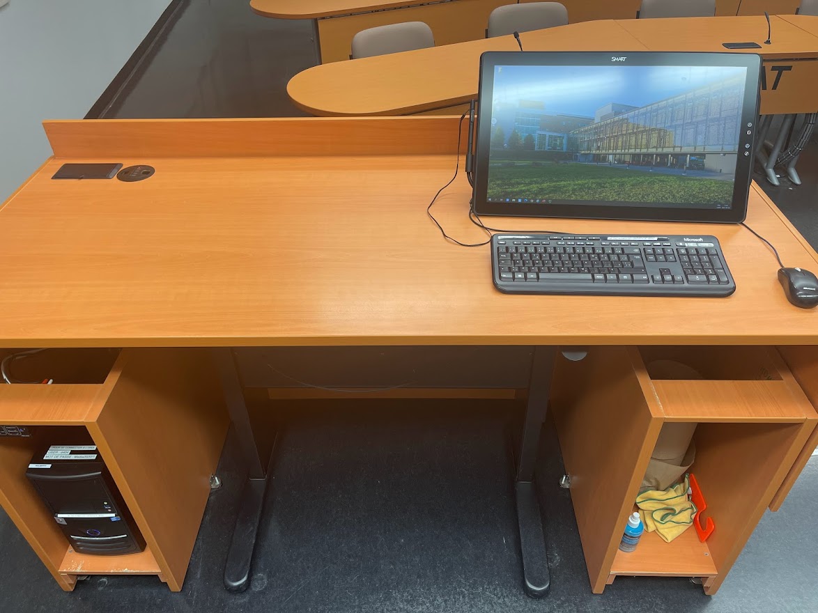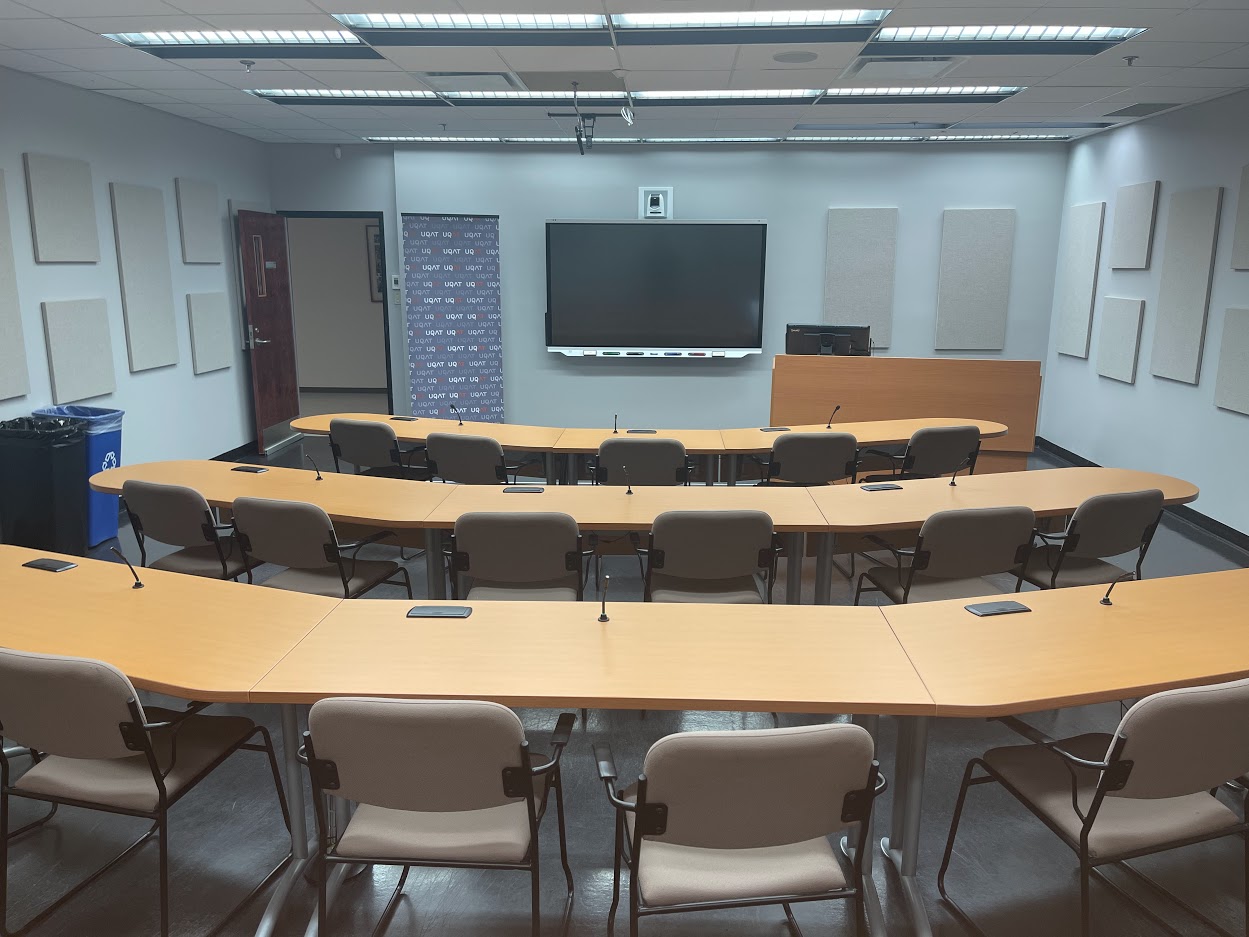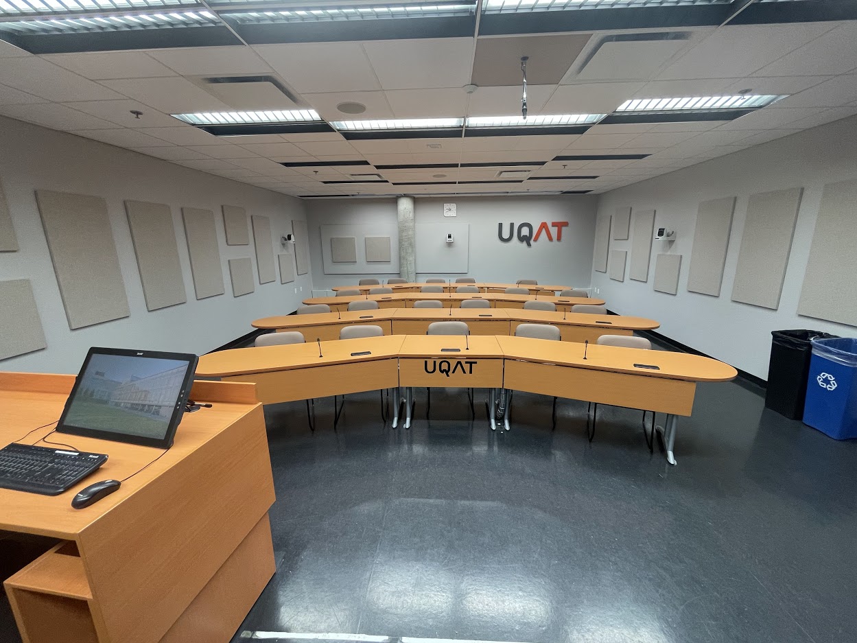 Le D404 se situe au 4e étage du campus de Rouyn-Noranda. Il s’agit d’un local insonorisé, sans fenêtre, servant principalement à la médiatisation (formation à distance). Il est muni de plusieurs équipements audiovisuels et informatiques tels qu’un tableau numérique interactif (TNI), un moniteur à stylet, un ordinateur de bureau et plusieurs caméras et microphones qui serviront à l’enregistrement de séances de médiatisation. Le mobilier qu’on y retrouve est fixe et ne peut être déplacé.