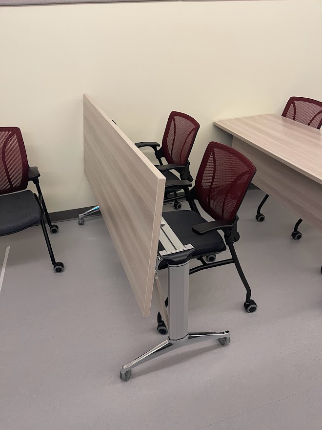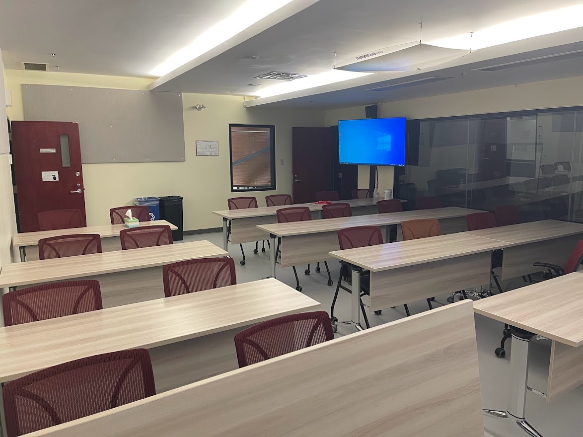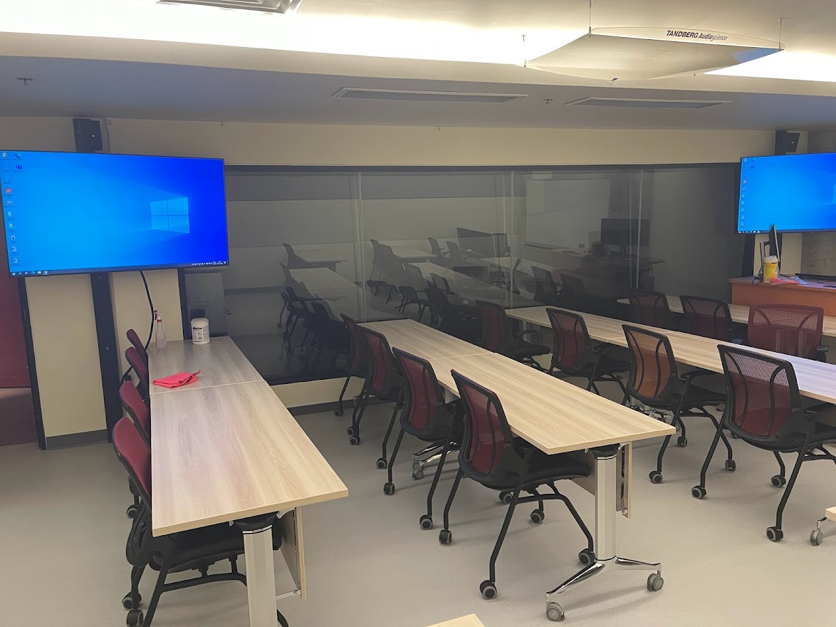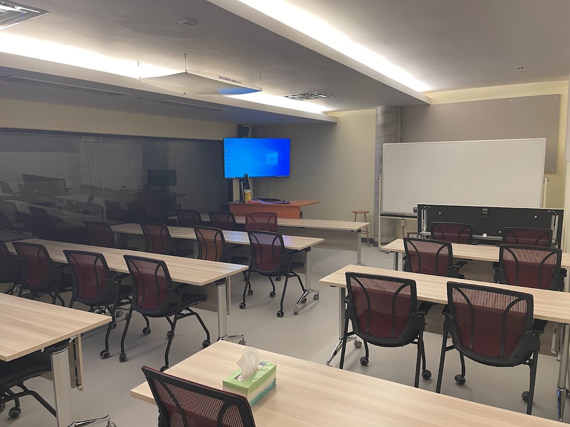 Le D423 est situé au 4e étage du campus de Rouyn-Noranda. Cette salle de classe sans fenêtre est adjacente à une autre pièce qui elle, peut servir de salle d'observation, de studio d’enregistrement audiovisuel ou à la création d’effets spéciaux à l’aide d’un fond vert. Un mur sans tain sert de séparation entre ces deux locaux et permet une diversité d'approches pédagogiques actives. Il est par contre important de noter que l’enseignement en comodalité y est impossible. Les écrans qui se trouvent dans le local servent seulement à partager de la documentation ou à projeter en direct les activités qui sont réalisées dans l’autre espace. Un tableau blanc effaçable à sec est le seul autre équipement disponible dans ce local pour l’enseignement magistral.