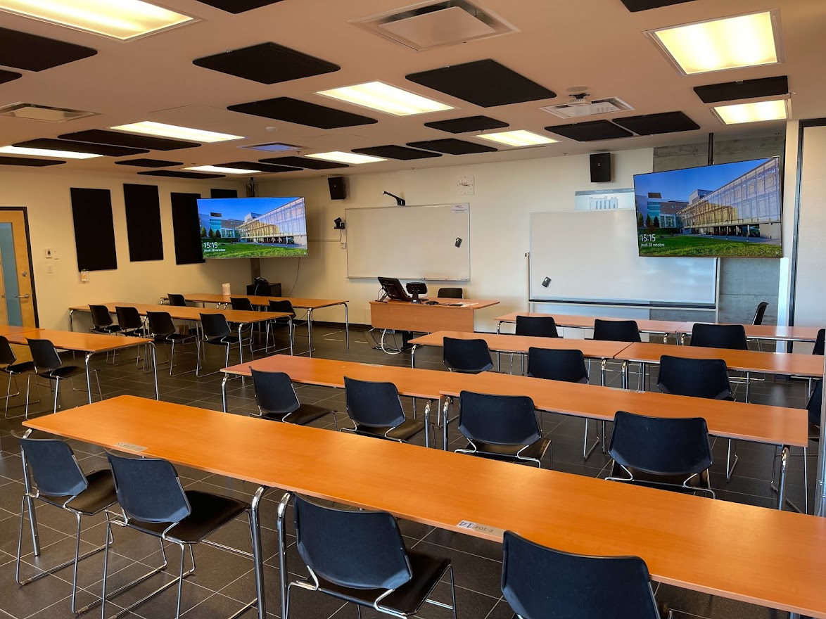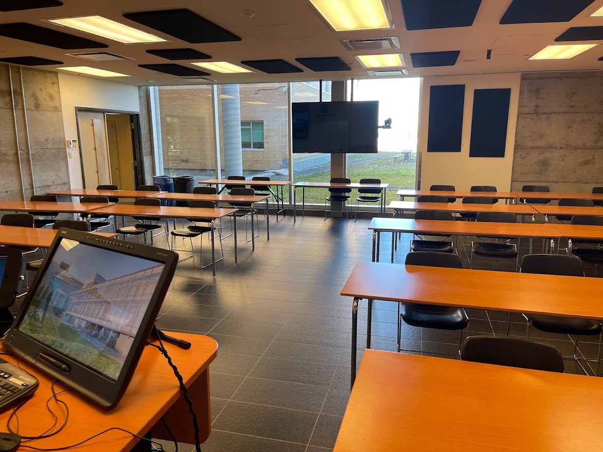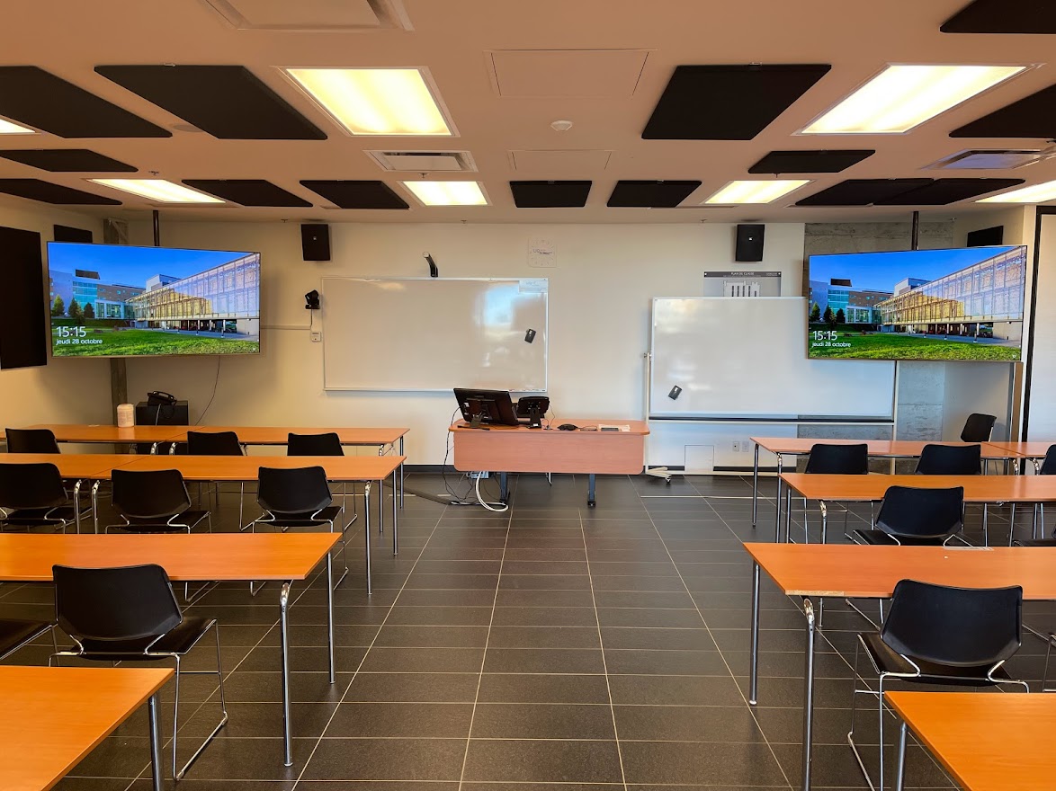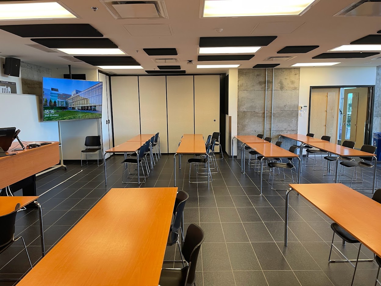 Le E104 est situé au rez-de-chaussée du campus de Rouyn-Noranda. Grâce à son mur rétractable, parce qu’il est particulièrement vaste et lumineux et qu’il se trouve tout juste à côté de l’atrium, il est aussi grandement utilisé pour les activités sociales de l’UQAT. On peut également y accéder par deux portes différentes. De type Zoom Room, cette salle de classe est munie de panneaux acoustiques installés au plafond qui l'insonorisent et qui améliorent la présentation des rencontres en visioconférence. Des écrans et des caméras s’y trouvent également pour la comodalité. Puisque le mobilier est amovible, la disposition des tables peut être repensée selon les besoins.