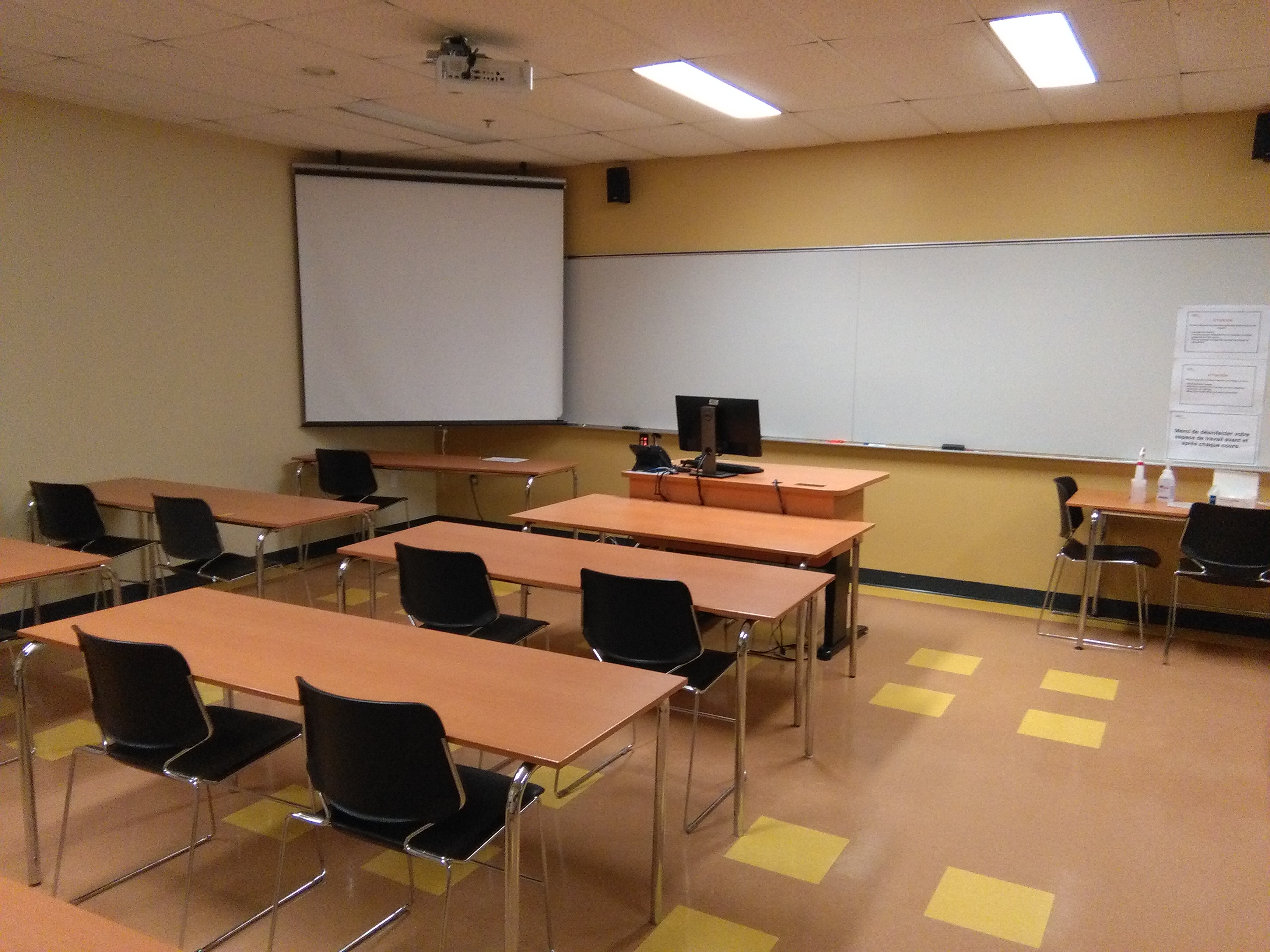 Local d’enseignement muni d’un projecteur et d’une toile pour les présentations.
