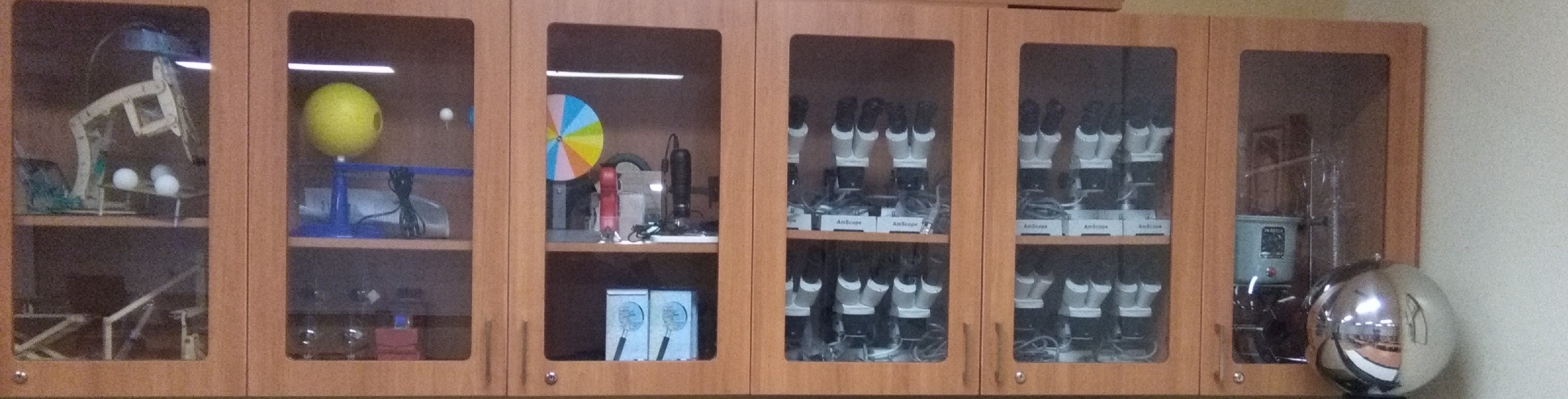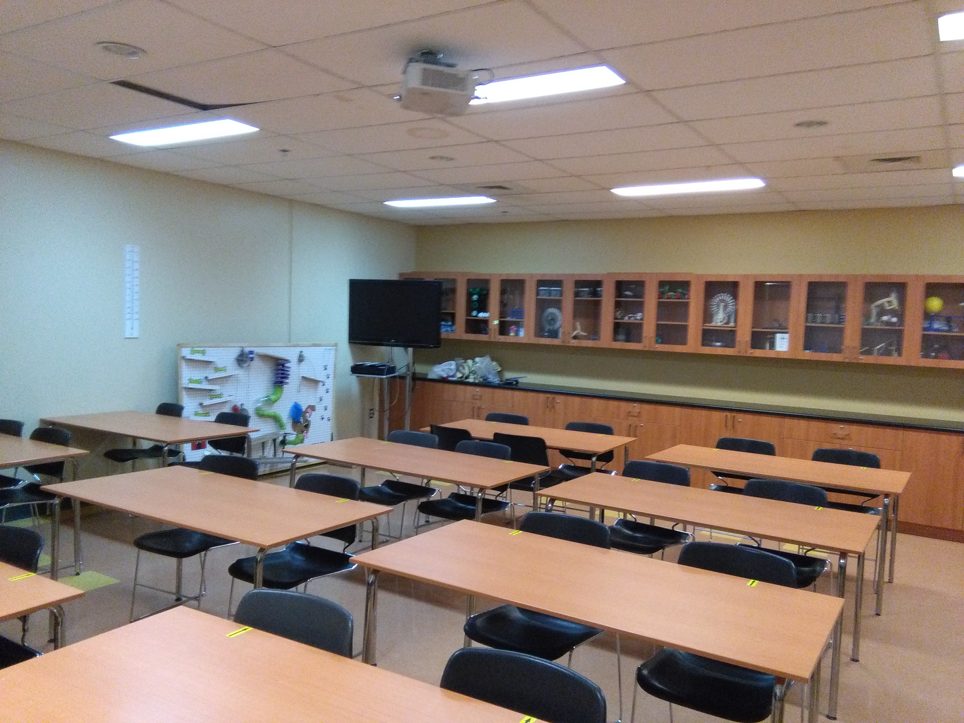 Local permettant l’enseignement des sciences composé d’armoires à cet effet en fond de classe, ainsi que d’un comptoir pour expérimentation ou démonstration.