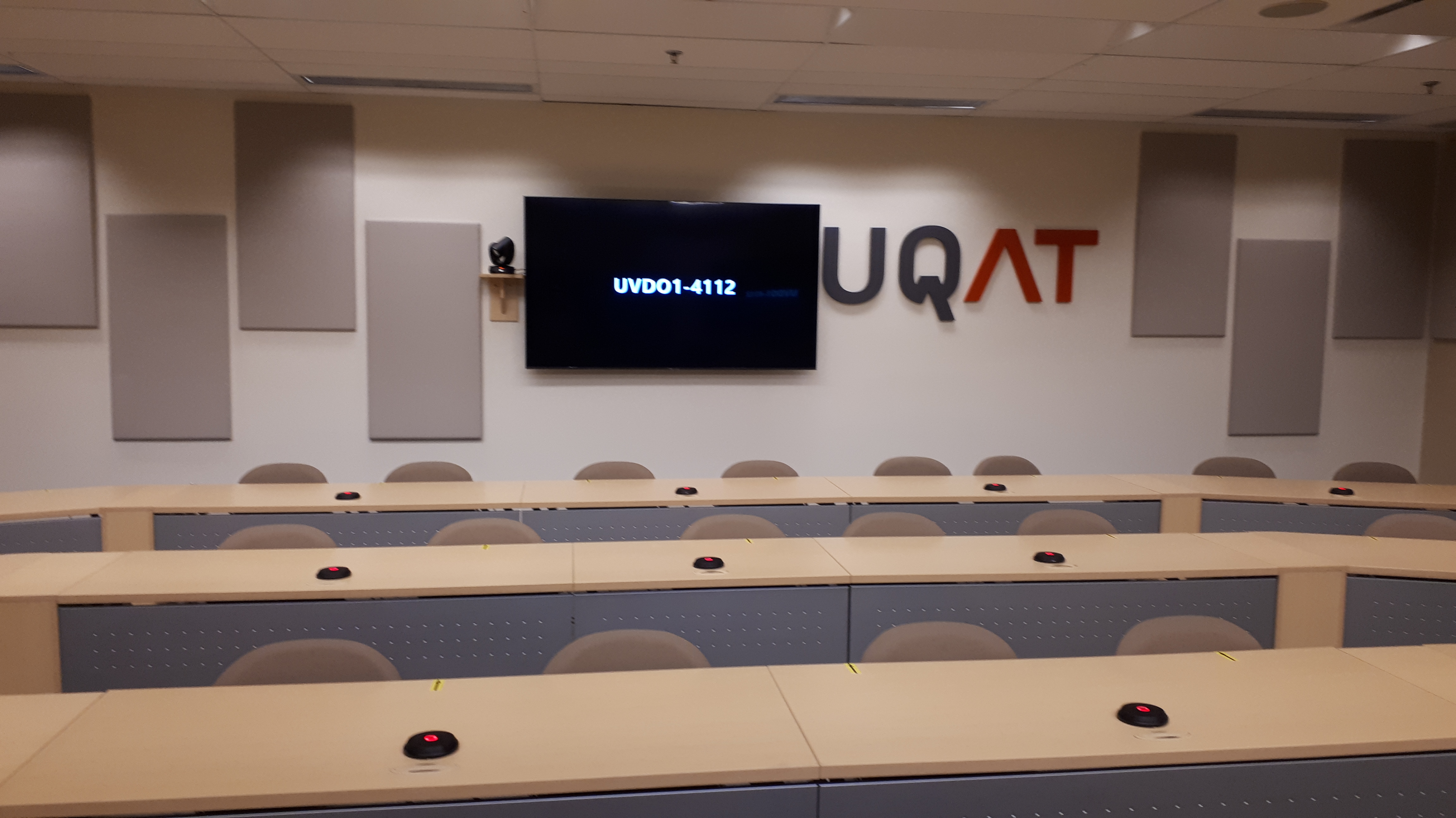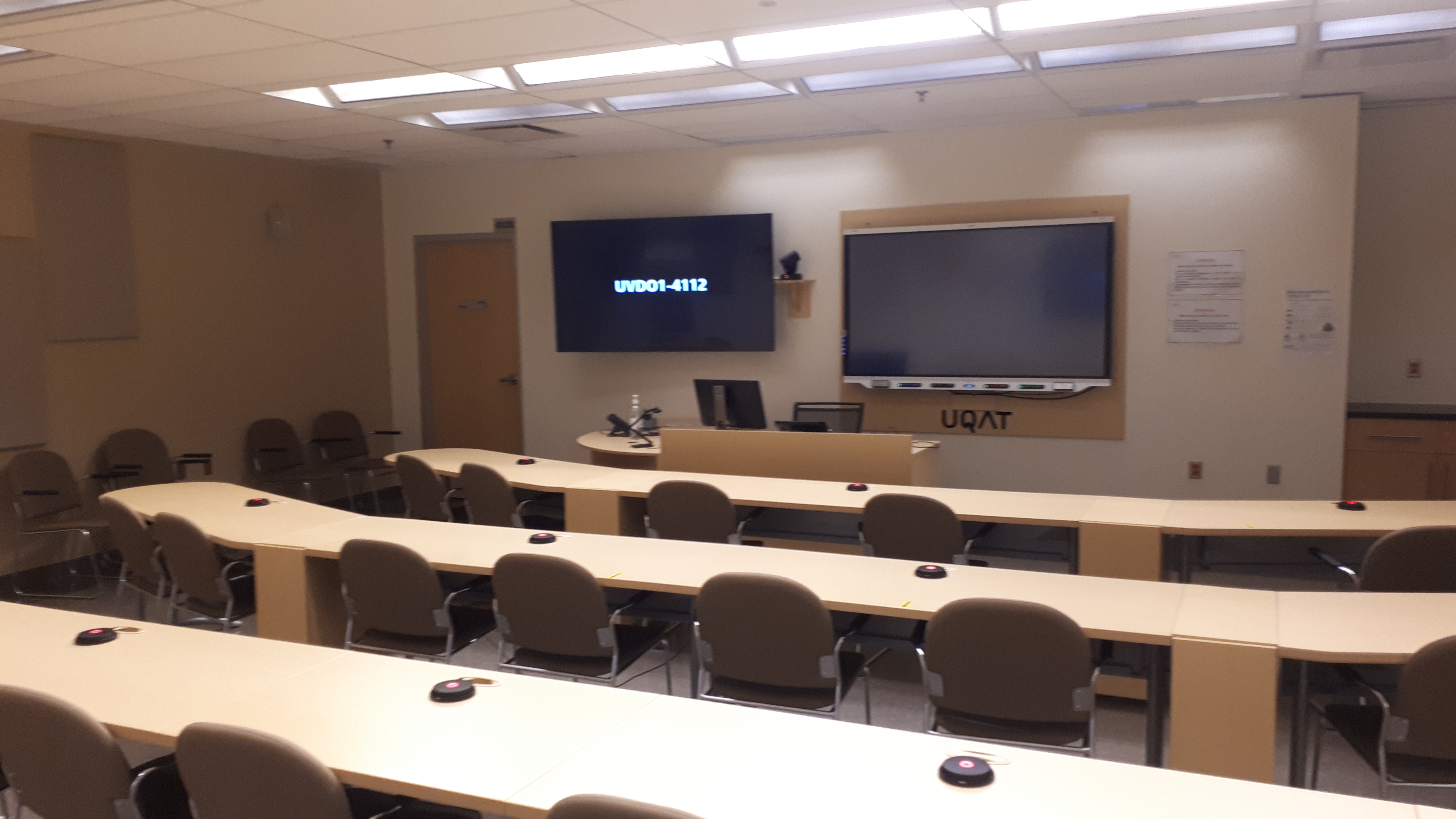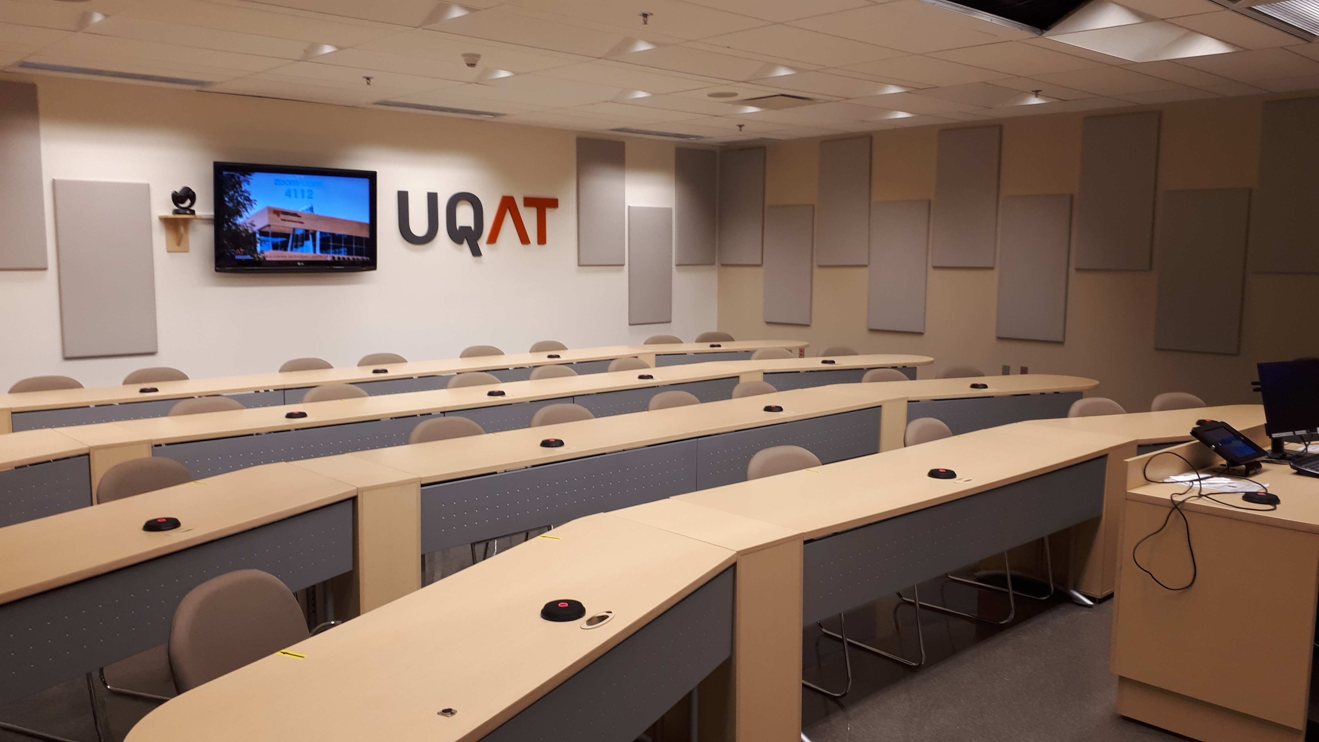 Aperçu des équipements : deux caméras (avant et arrière), deux téléviseurs, un tableau numérique interactif, une tablette IPad, des microphones intégrés aux tables nécessitant d'être appuyés.