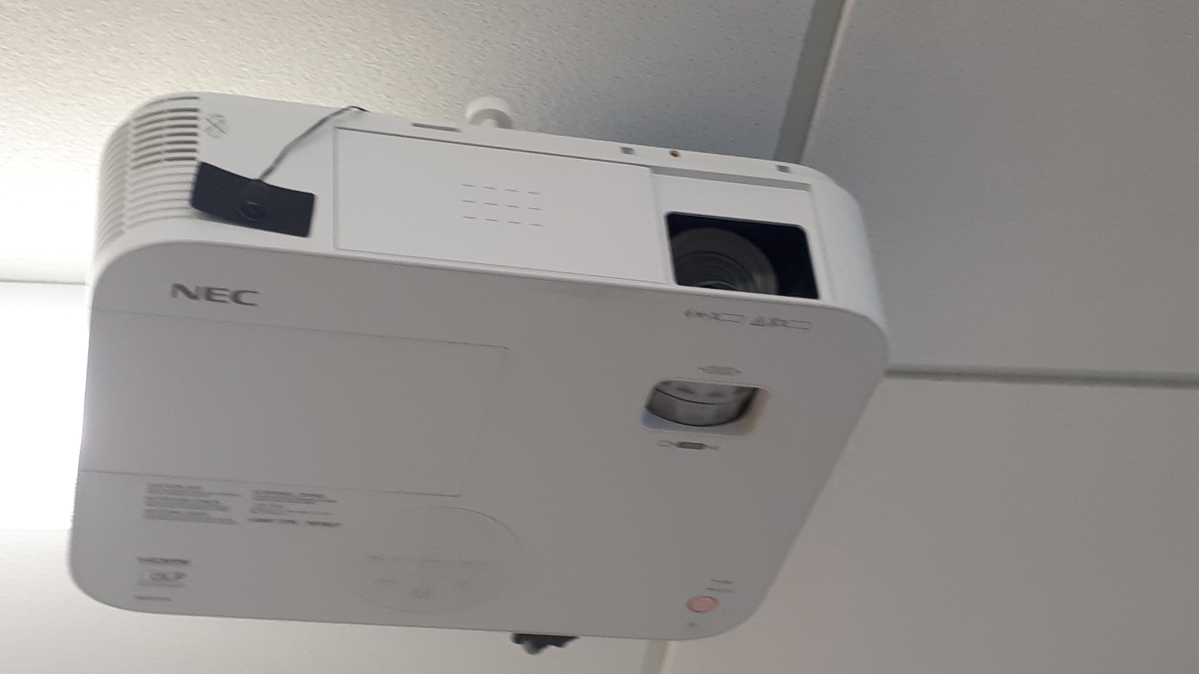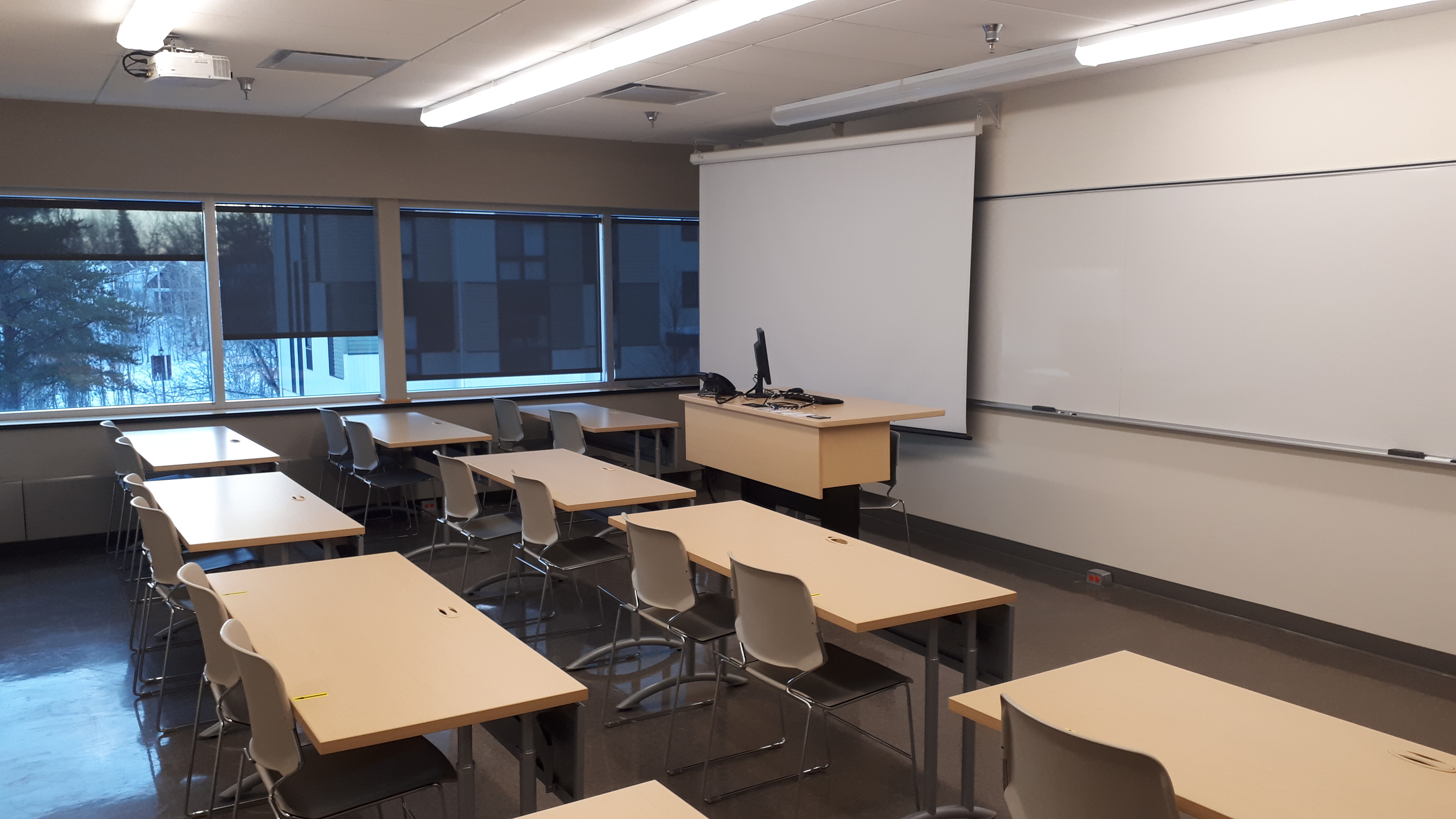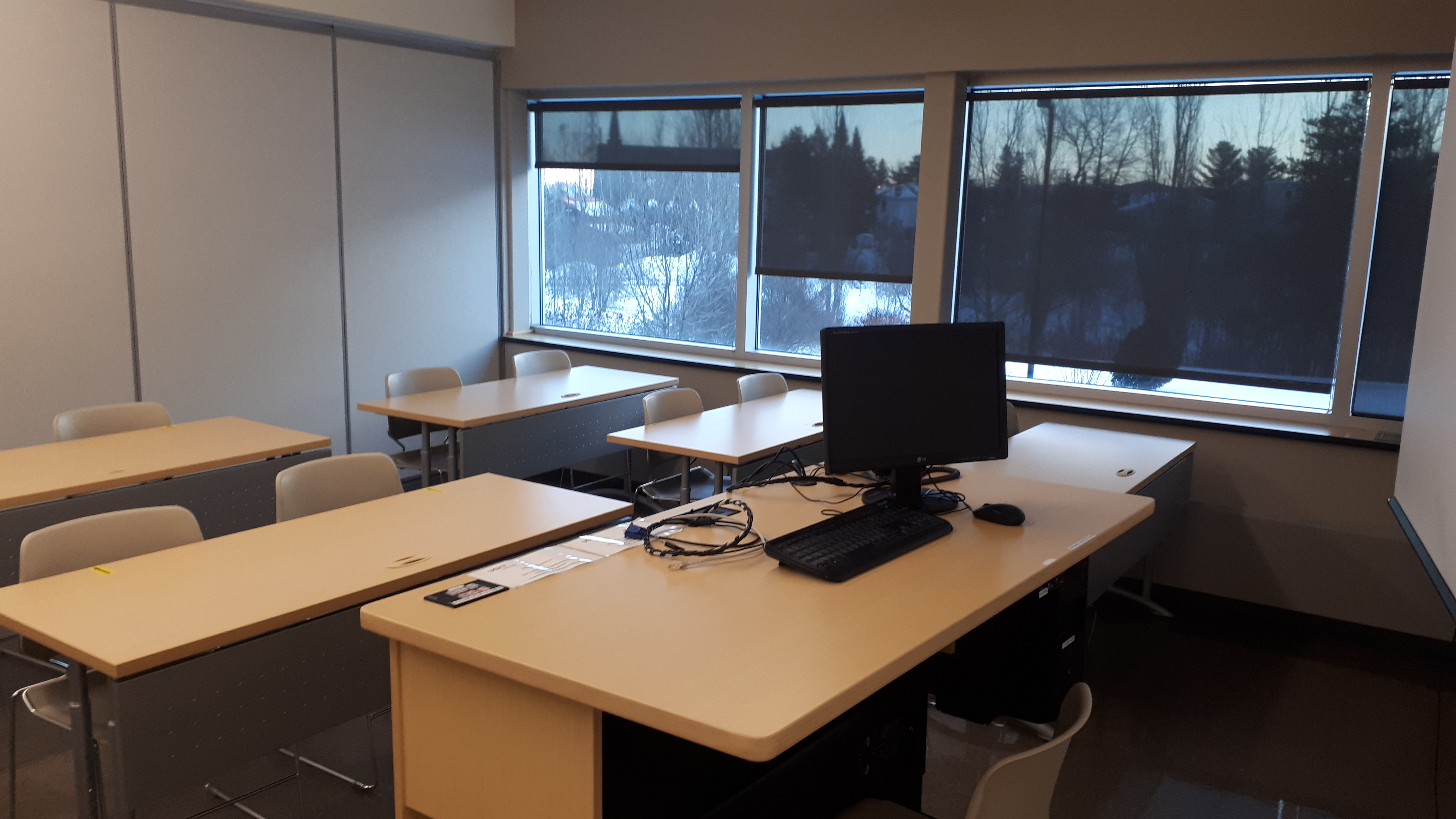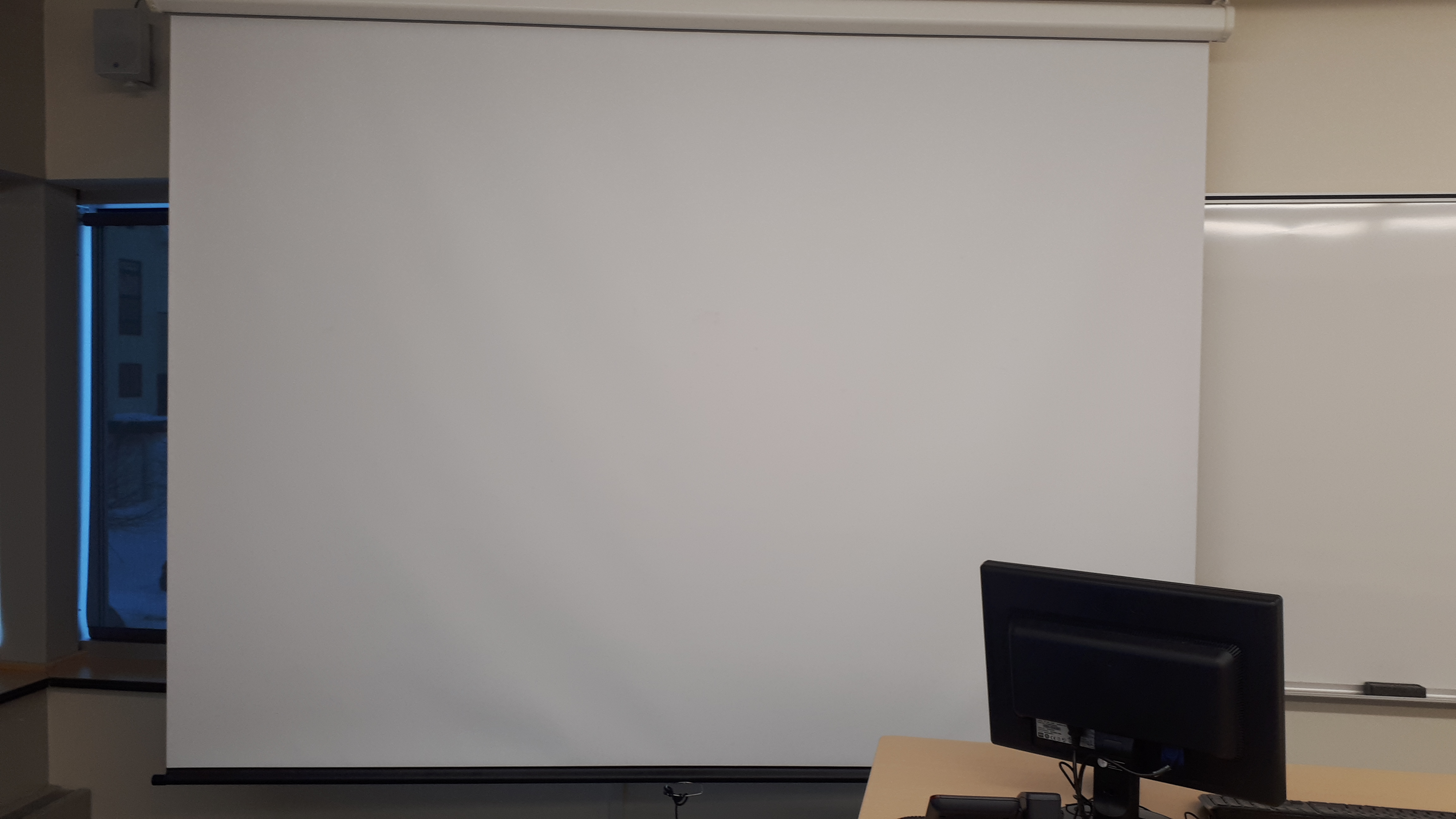 Local de classe de petite taille possédant peu d'équipements technologiques (tableau blanc sec, toile, projecteur).