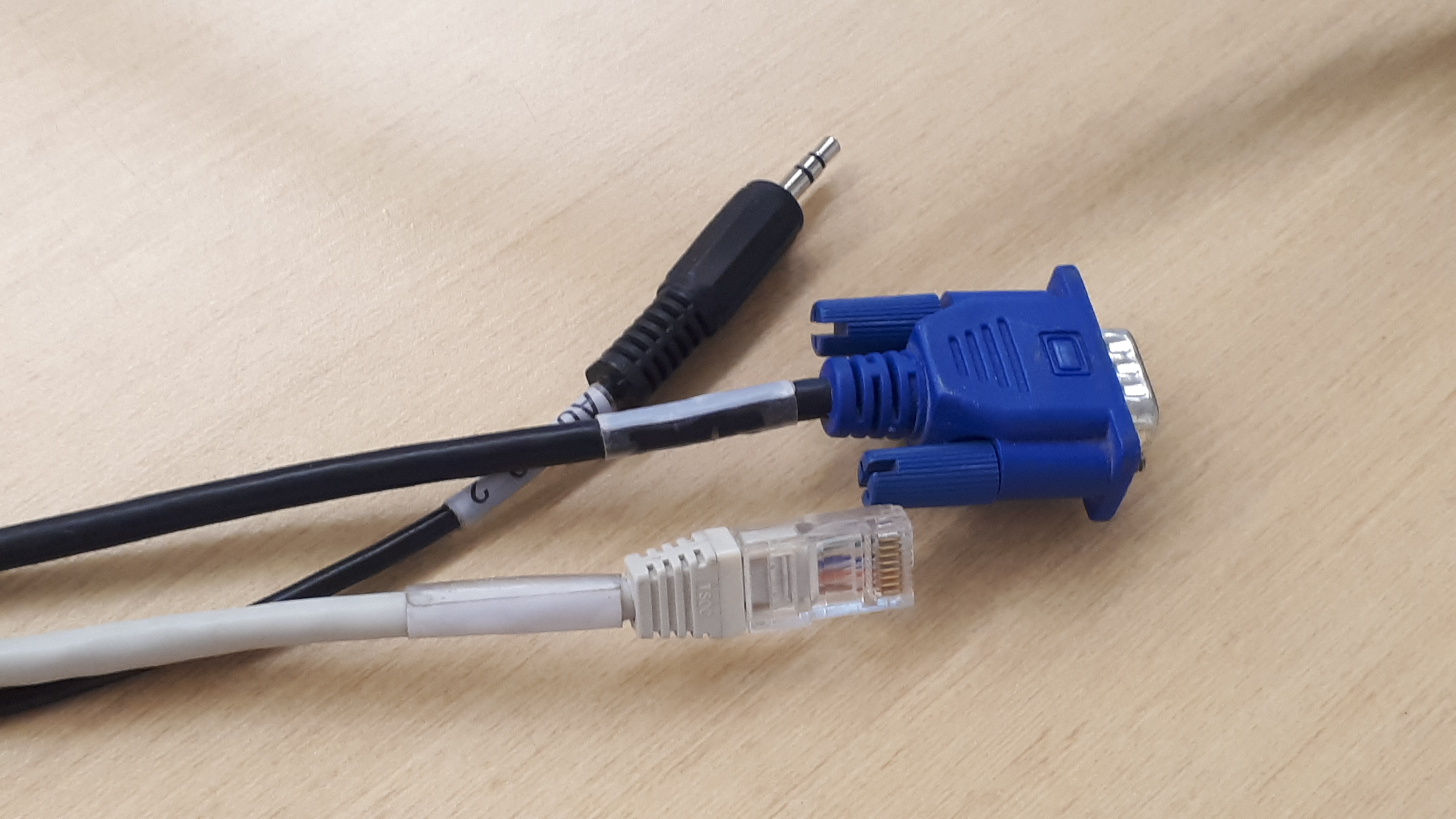 Branchement par port VGA : Un ordinateur est à disposition dans le local. Cependant, si l’utilisation d’un ordinateur personnel est souhaitée, le branchement filaire se fera via un VGA (image), un Jack 1/8 son et un fil réseau.
