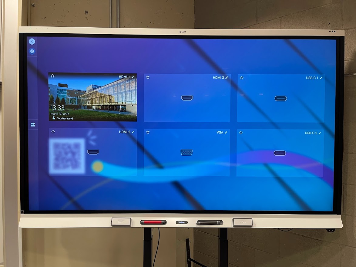 4. Choisissez la source à utiliser. Notez que l’affichage du bureau de tous les ordinateurs branchés sera en prévisualisation dans l'écran du TNI. Il faut donc sélectionner l’outils que vous prévoyez projeter sur l'écran du TNI en appuyant sur cet onglet de prévisualisation. Ordinateur du local: HDMI 1 Équipement informatique personnel (branché à un fil HDMI): HDMI 2 / HDMI 3 ![]() |