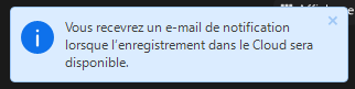 5- Une alerte s’affichera, en haut à droite, afin d’indiquer le lien de l’enregistrement sera envoyé à votre boîte courriel. |
