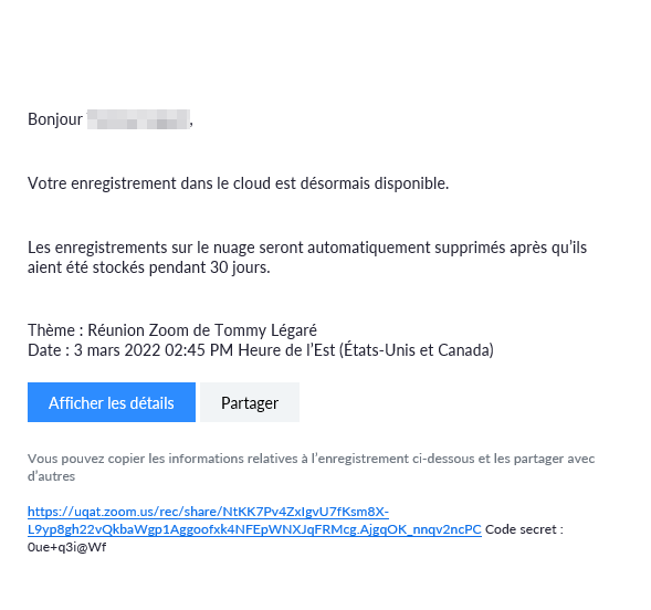 1- Dans le courriel reçu après la fin de l’enregistrement, cliquer sur “Afficher les détails”. |