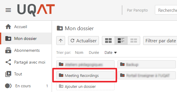 3- Cliquer sur le sous-dossier “Meetings Recordings”. |