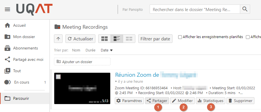 Procédure pour récupérer un enregistrement réalisé avec Zoom et téléversé automatiquement vers Panopto (intégration Zoom-Panopto) |
