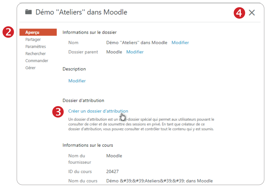 Cette étape (2 de 3) permet de créer un dossier d’attribution. Ce type de dossier (sous-dossier du dossier de cours) permet à l’enseignante et l’enseignant de créer l’espace de dépôt où les étudiantes et étudiants pourront créer/téléverser leurs vidéos. Chaque vidéo est sécurisée et est accessible seulement par (1) le créateur et (2) l’enseignante ou l’enseignant.