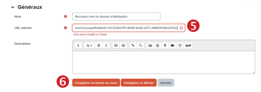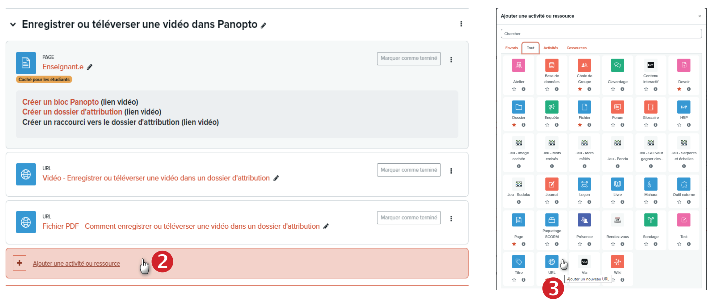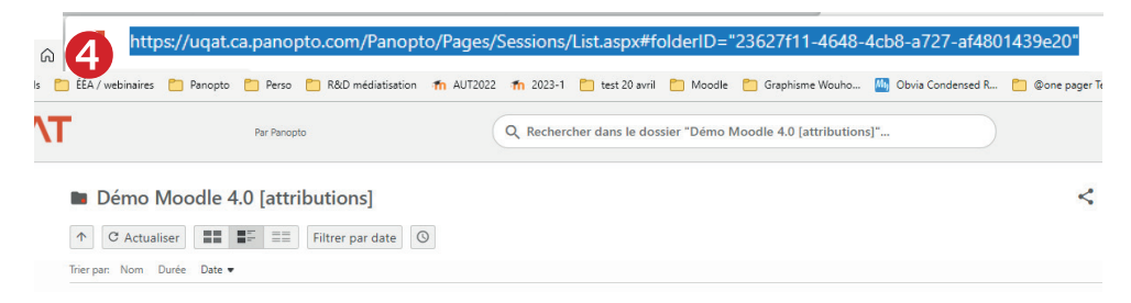 Cette étape (3 de 3) permet de créer un raccourci (URL) sur votre espace de cours Moodle vers le dossier Panopto. Cette étape est techniquement facultative, mais elle permet de rendre le processus beaucoup plus simple et facile d’accès pour les étudiantes et les étudiants du cours, et même pour l’enseignante et l’enseignant. Il n’y a pas à chercher le dossier sur le site de Panopto : rien de plus simple que de cliquer sur le lien visible sur Moodle.