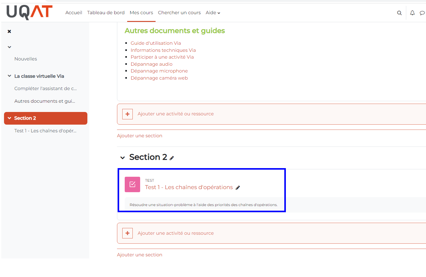 2. Voici un exemple avec une activité nommée Test 1 - Les chaînes d’opération. ![]() |