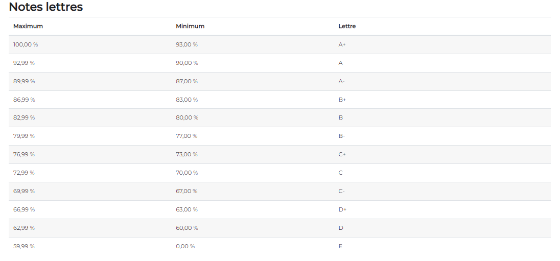 c) Valider que les notes alphanumériques correspondent bien entre votre Plan de cours et votre Moodle. Soyez très vigilants avec les décimales, Moodle n’arrondira pas à l’unité supérieure. ![]() |