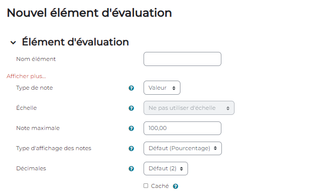 d) Déterminez les paramètres de l'élément d'évaluation ![]() Le nom d'élément correspondra au nom donné à votre élément d'évaluation, par exemple : examen de mi-session, examen final, etc. Le type de note sera, dans la grande majorité des cas, Valeur. La note maximale. Si vous mettez 100 ou une autre valeur qui ne correspond pas à la valeur réelle de l’activité comme note maximale, vous devrez alors ultérieurement ajuster la pondération dans votre carnet de notes (voir section 4.2). Si vous indiquez plutôt la valeur réelle de la note telle que définie dans votre plan de cours, entrez alors la note maximale pour cette évaluation. Le type d’affichage des notes et les décimales devraient, normalement, demeurer à Défaut. À moins que vous ne souhaitiez que Moodle prenne en compte davantage de décimales. |