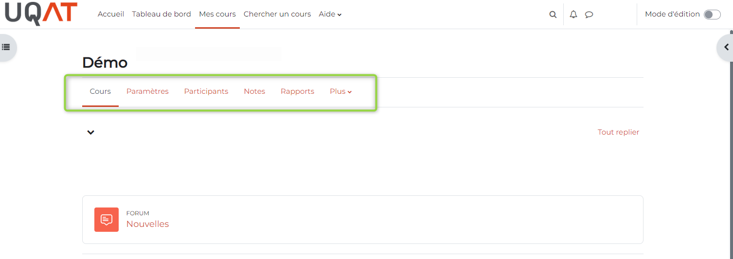1. Repérez le menu de navigation dans le haut de la page, sous le titre de votre cours. ![]() |