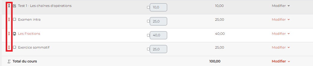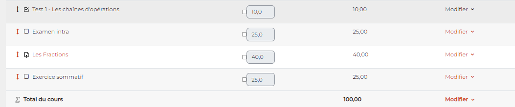 Dans l’exemple ci-dessous, nous trouvons deux activités créées directement dans le cours (un test (Test 1) et d’un dépôt de travail (Les fractions) ainsi que deux éléments d'évaluation entrés manuellement (Examen intra et Exercice sommatif) ![]() La somme des pondérations accordées à chacune des activités est de 100, donc de la valeur totale du cours. |
