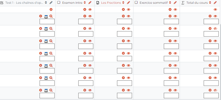Apparaîtront alors les éléments d'évaluation et activités, ainsi que les noms des étudiants à la gauche. Vous pourrez alors entrer/modifier manuellement les résultats. ![]() |