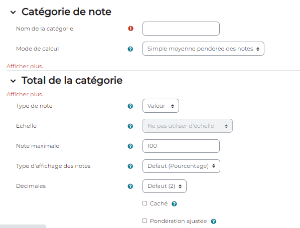 La création de catégories dans le carnet de notes permet de regrouper des évaluations dont la valeur est identique. La manœuvre peut simplifier la configuration lorsqu’il y a de nombreuses évaluations. Par exemple, l’ensemble des évaluations formatives peuvent être regroupées dans une même catégorie valant zéro. Essentiellement, la création de catégories vous permettra d’intégrer plusieurs activités et éléments d'évaluation dans cette même catégorie. La pondération dépendra ensuite du choix que vous sélectionnerez. Pour créer une catégorie de notes : |