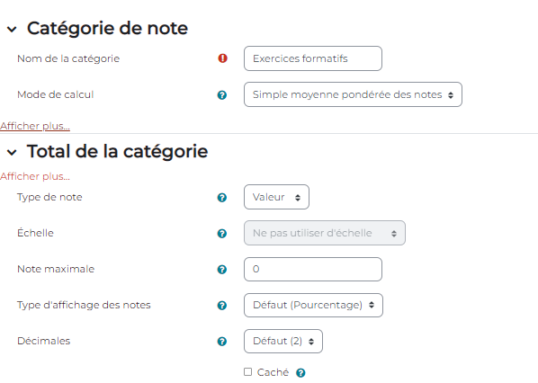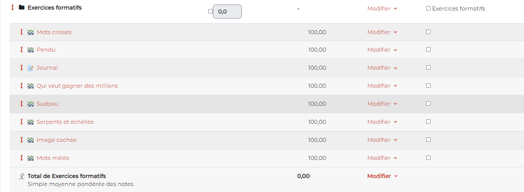e) Exemple avec des exercices formatifs Nous rassemblerons pour cet exemple toutes les activités formatives dans une catégorie et nous accorderons 0 comme valeur à cette catégorie, puisque ce sont des activités formatives. Dans les paramètres de la catégorie : ![]() Une fois la catégorie créée, nous rassemblerons les activités dans celle-ci. Par exemple : ![]() Ainsi, chacune des activités dans cette section, bien que notée sur 100 et ainsi permettant une rétroaction quantifiée aux étudiantes et étudiants, n’aura aucune valeur au final, puis dans la catégorie exercices formatifs. |
