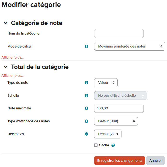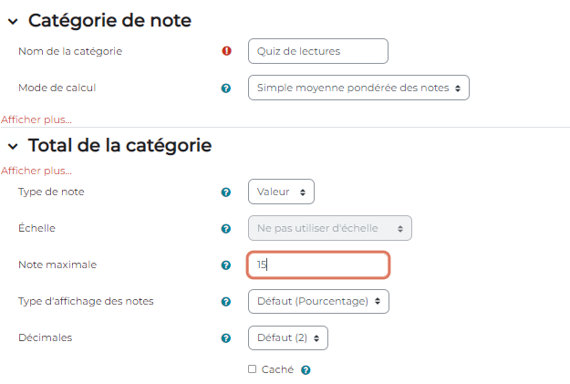 d) Ajustez les paramètres comme suit : Mode de calcul : Moyenne pondérée des notes Note maximale : 100 Puis enregistrez les changements. ![]() |