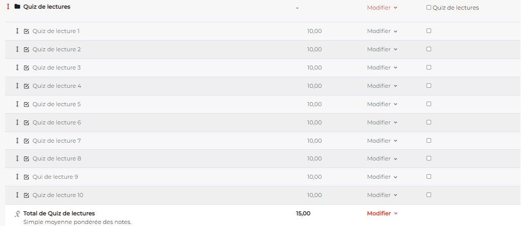 f) Exemple avec quiz de lecture De la même manière, nous pourrions regrouper dans une seule catégorie tous les quiz de lecture d’un cours ou toutes les activités de nature similaire. Dans l’exemple suivant, nous avons nommé la catégorie Quiz de lecture et nous avons accordé 15 points au total du cours à cette catégorie. La simple moyenne pondérée des notes, comme nous l’avons indiqué, permettra de pondérer la moyenne des résultats en fonction de la note maximale accordée à chacune des activités contenues dans cette catégorie. ![]() La seconde étape consiste à déposer à l’intérieur de cette catégorie, les activités Test s’inscrivant dans cette catégorie. Dans l’exemple, nous avons regroupé 10 quiz de lectures, chacun étant évalué sur 10 points. Dans la catégorie, ils seront alors ramenés sur 15. La valeur de chacun dans entre eux sur alors pondéré sur leur valeur (10). Dans le cas suivant, comme ils ont tous la même valeur, ils vaudront donc 1,5 % chacun du total du cours. ![]() |
