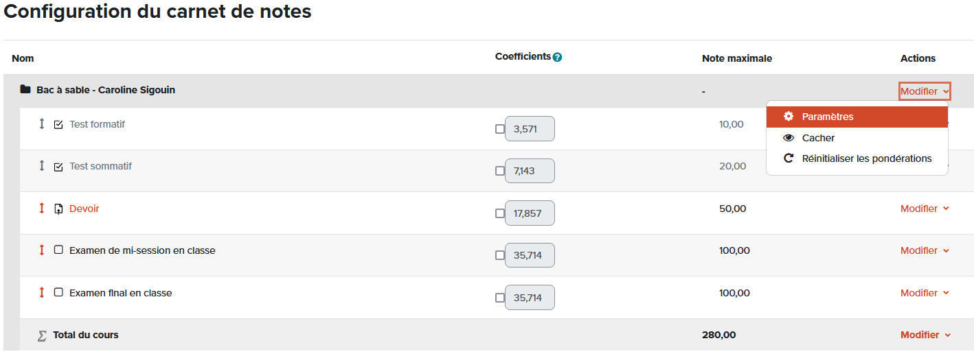 Les activités créées dans Moodle (comme les Tests) se retrouvent automatiquement dans le carnet de notes. Si leur correction se fait sur un nombre de points différent de leur valeur dans le cours, leur pondération devra être ajustée (voir section 4.2).