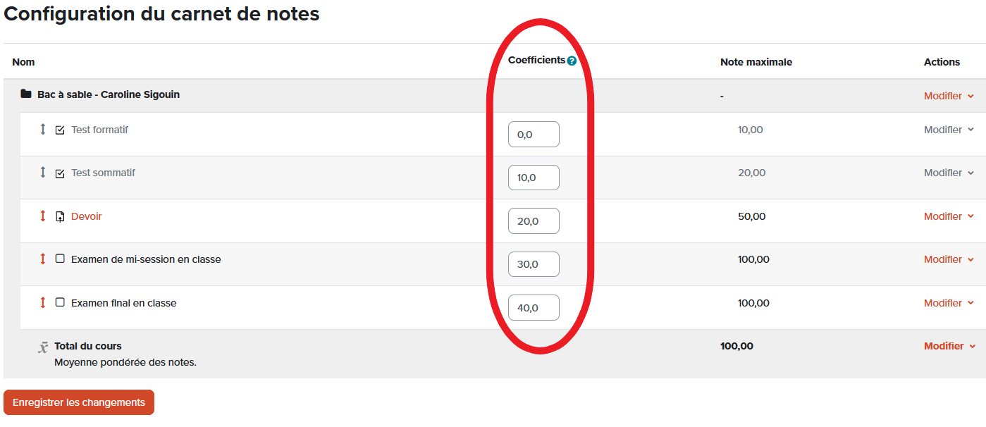 e) Ajustez finalement les coefficients selon la pondération des évaluations, puis enregistrez les changements. ![]() |